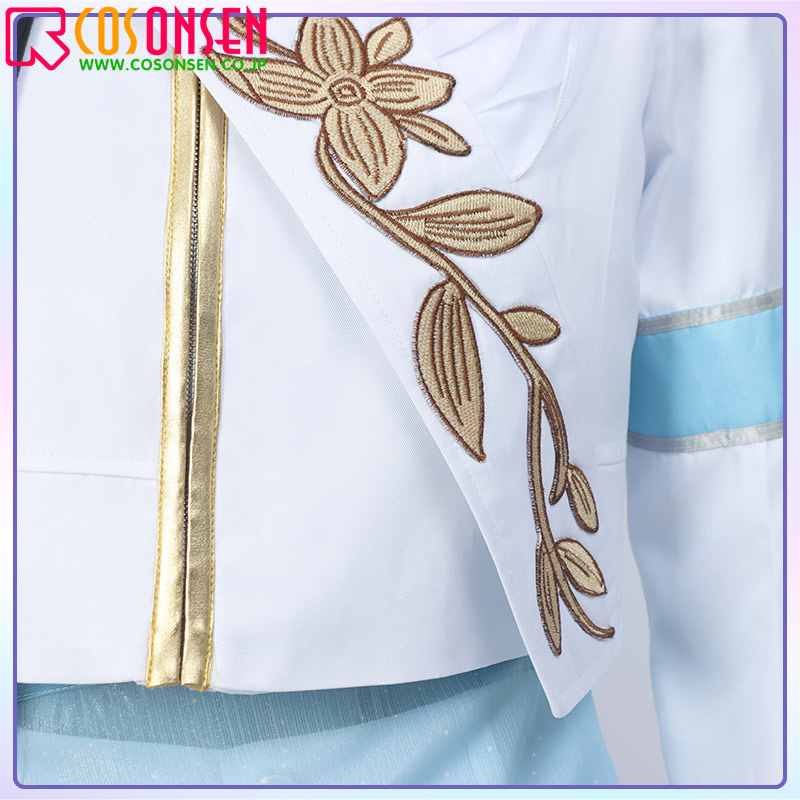 ポリエステルギャバで製作しています。肩布付きの白を基調とした上着で、高級感満々で原作に充実な作りになっています。