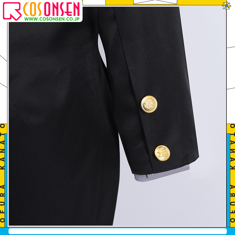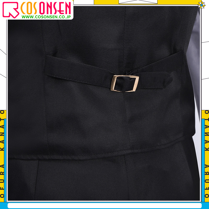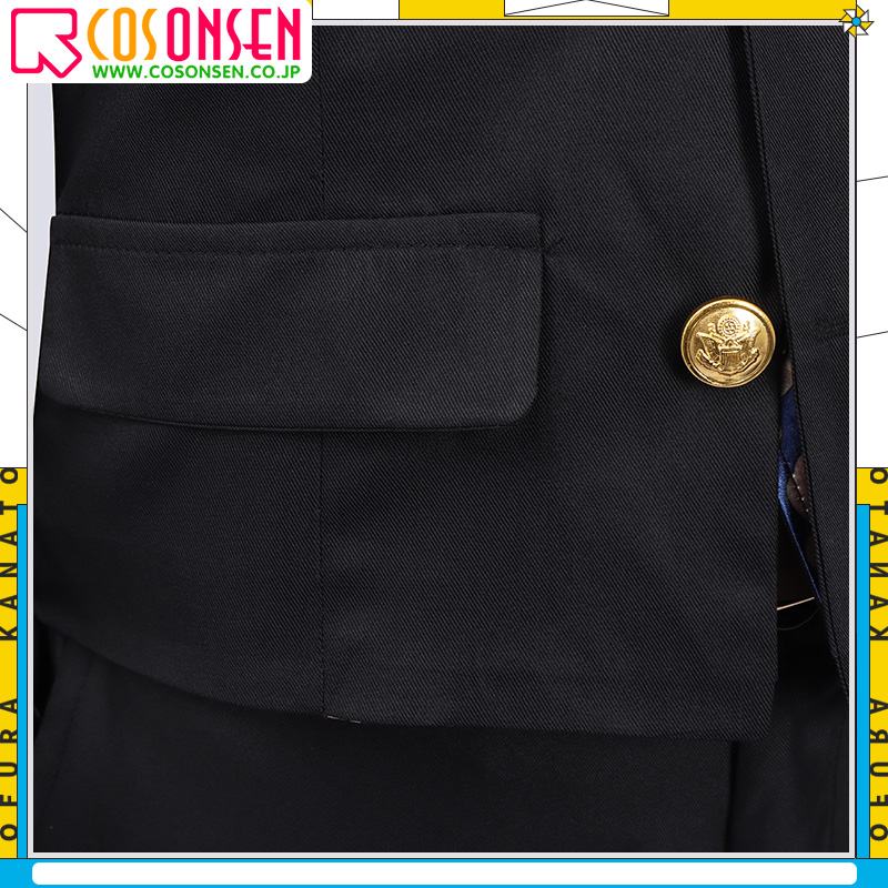 ポリエステルギャバで製作しています。黒を基調として、両サイドにフェイクポケットが施されています。胸先に綺麗な刺繍が飾ってあり、再現度が高いです。