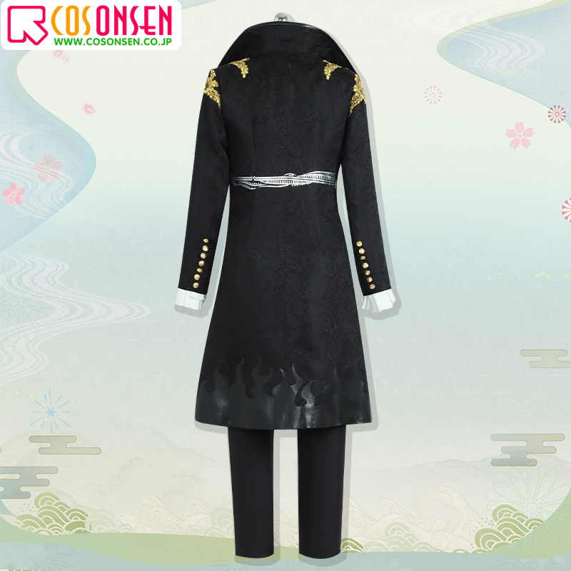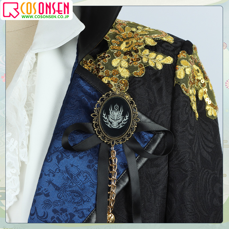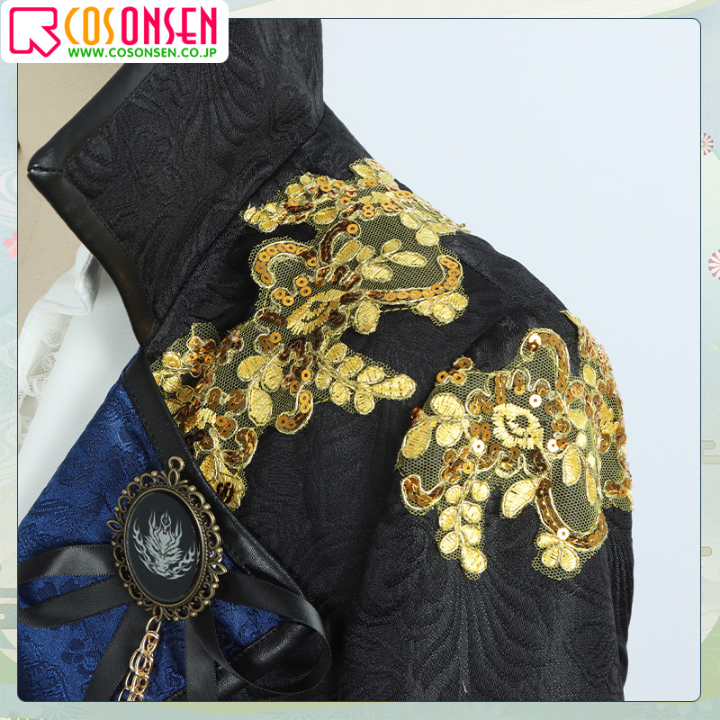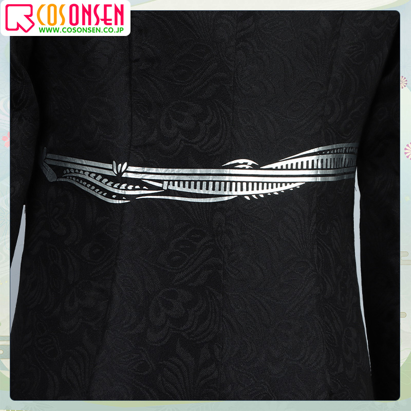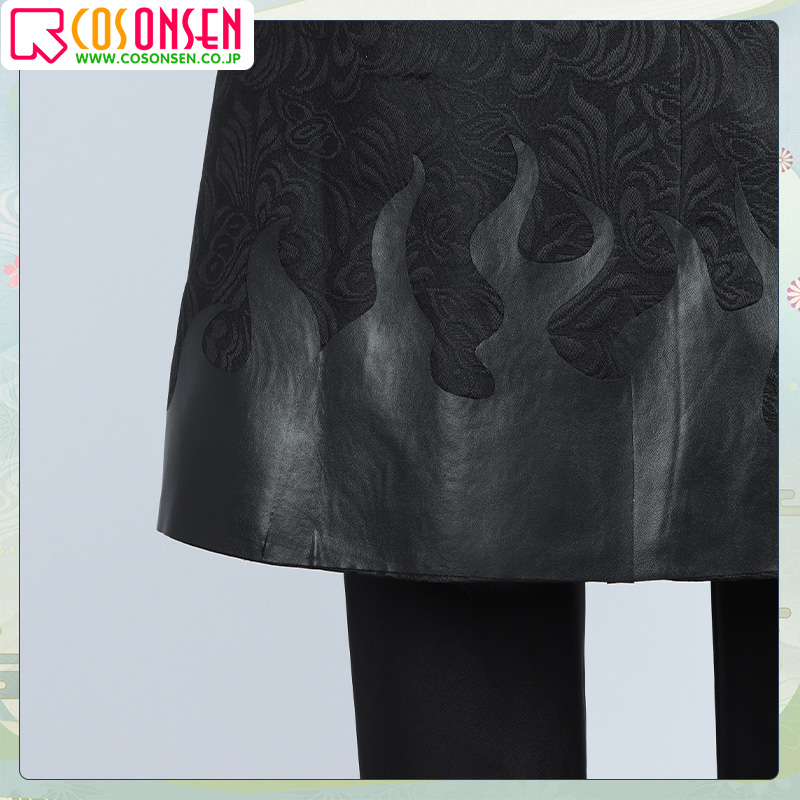 ジャガード生地で製作しています。黒を基調として、両肩に金色の刺繍片を縫い付けて、裾に炎のような柄が飾ってあり、かっこいいです。