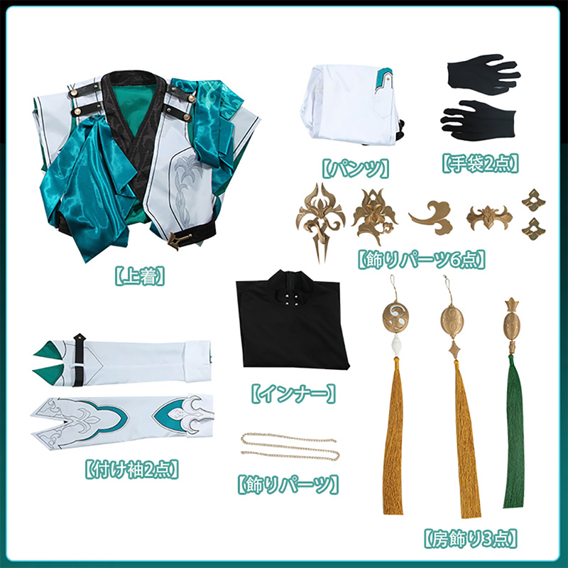 上着、インナー、パンツ、飾り物(付け袖2点、手袋2点、ベルト、飾りパーツ6点、房飾り3点)