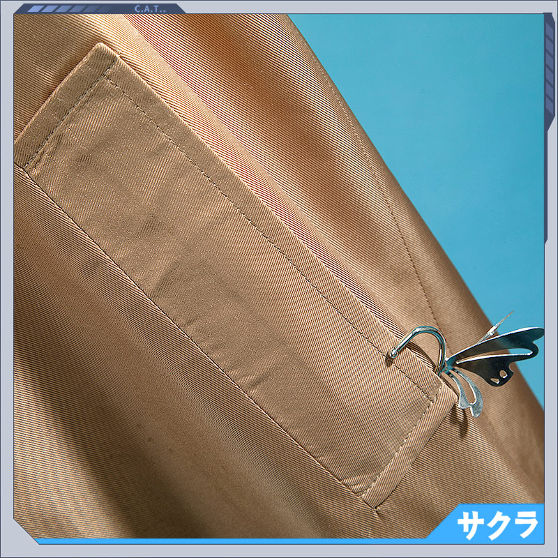 ポリエステルツイルで製作しています。襟に人工ファーが付いています。両サイドに本物のポケットが施されて実用性が高いです。