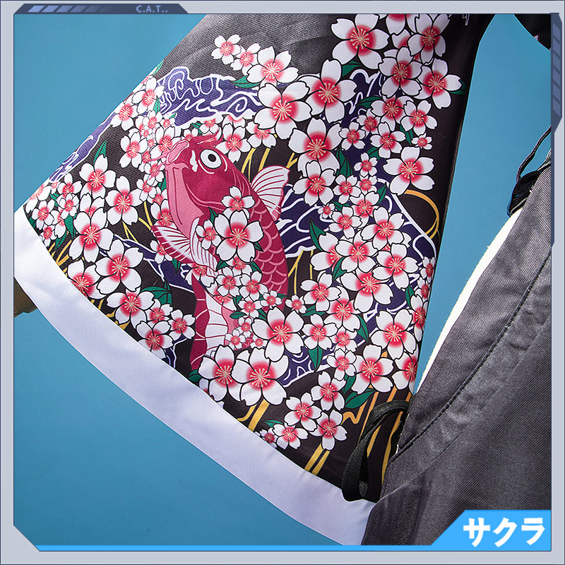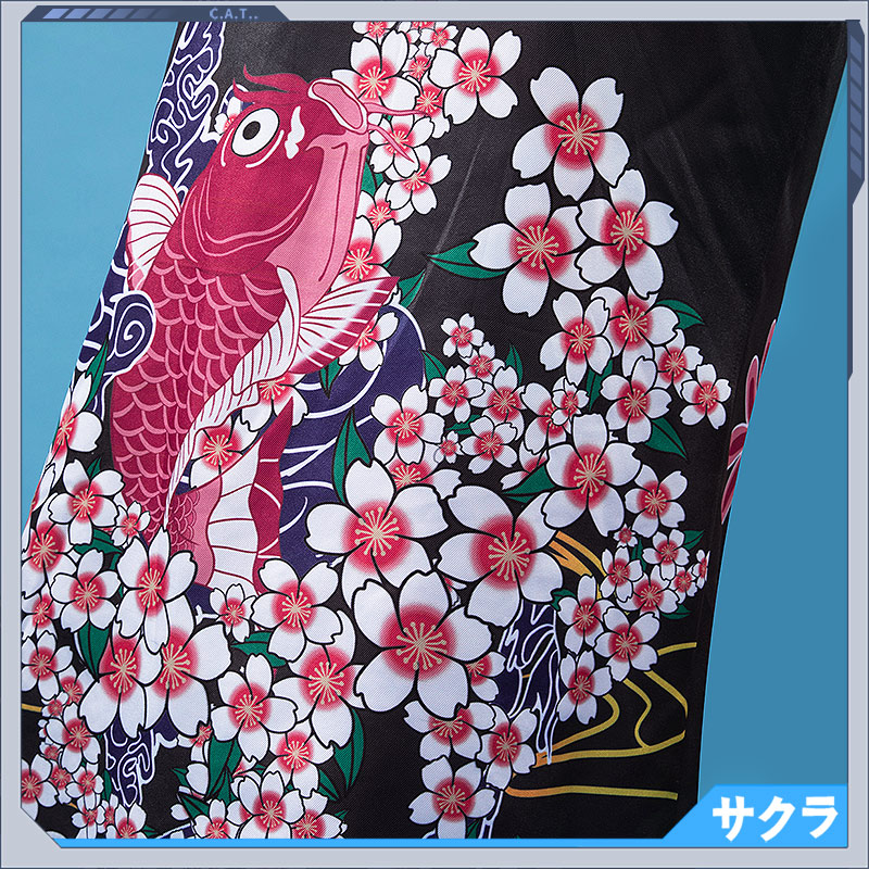 ポリエステルギャバで製作しています。袖とフロントに桜と鯉の絵柄がプリントされて綺麗です。
