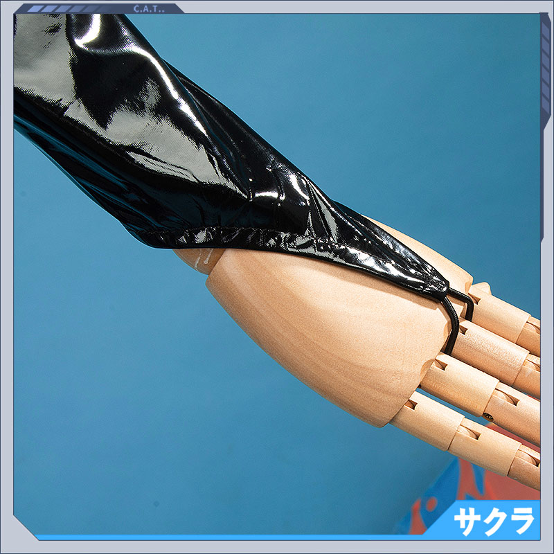 合皮で製作しています。袖口にループを付けて、指を入れることができてかっこいいです。丈夫な素材を使ったので長く使うことができます。