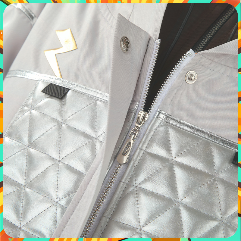 ポリエステルギャバと合皮で製作しています。フード付きのジャケットで、胸先に電光のような柄が施されてかっこいいです。