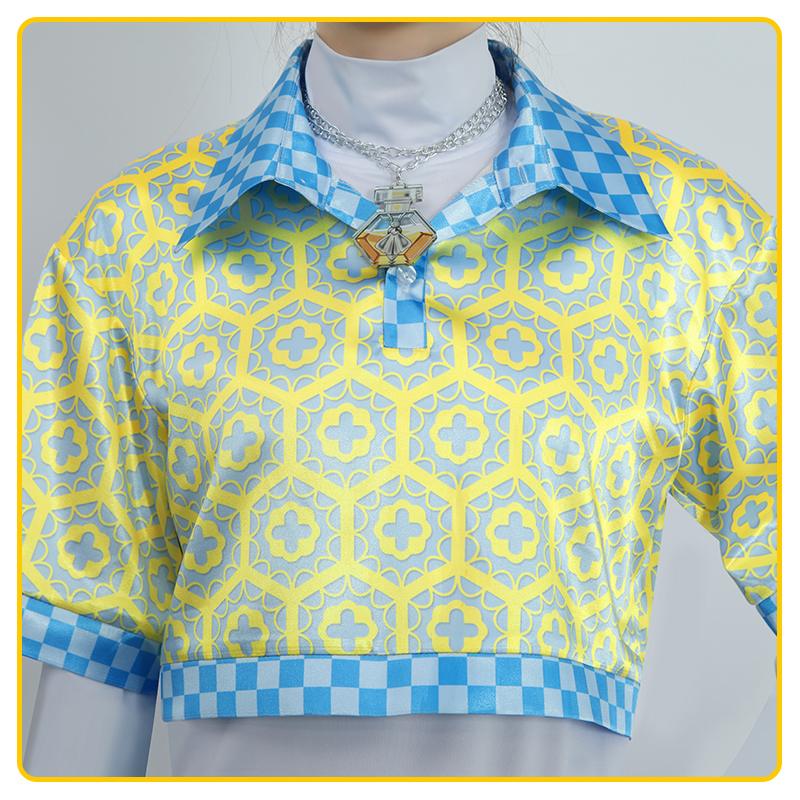 サテンで製作しています。へそ出しの半袖シャツで、蜂房のような絵柄がプリントされて個性的です。