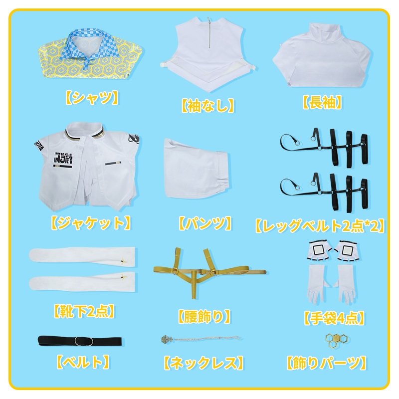 ジャケット、袖なし、シャツ、長袖、パンツ、飾り物(ネックレス、飾りパーツ、手袋4点、ベルト、ベルト、レッグベルト2点、靴下2点)