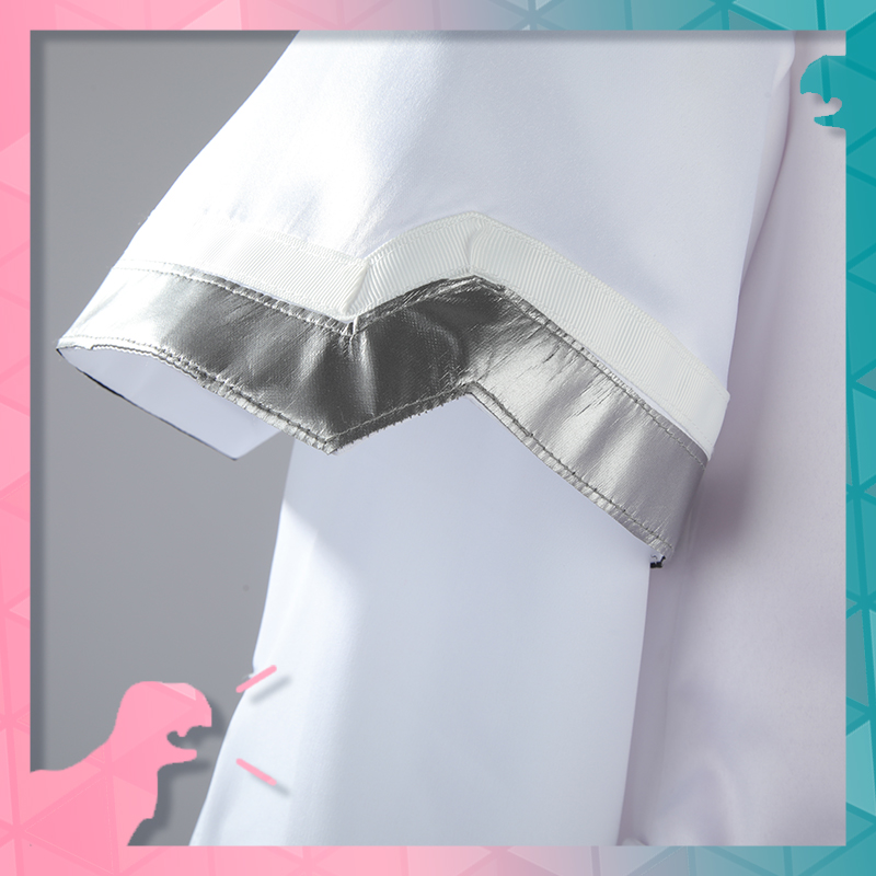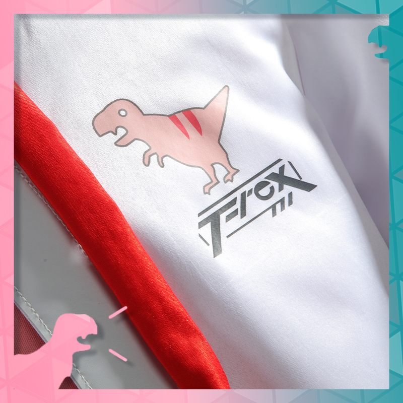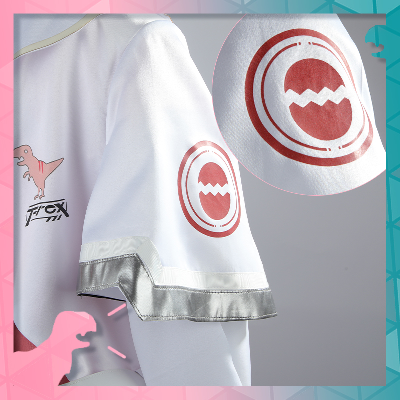 主にサテンで製作しています。白を基調として、胸先に可愛い恐竜がプリントされて綺麗に見えます。