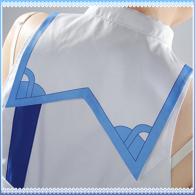 ポリエステルギャバとダンボールニット生地で製作しています。白とブルーを基調として、襟と裾に絵柄ががプリントされて綺麗に見えます。右側にチャックが付いて脱着が便利です。