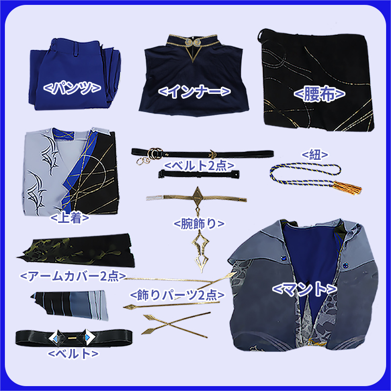 マント、上着、インナー、パンツ、飾り物(紐、アームカバー2点、腕飾り、腰布、ベルト3点、飾りパーツ2点)