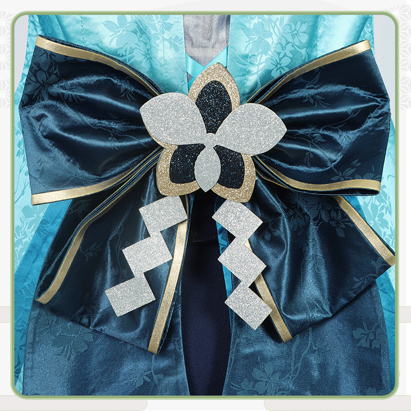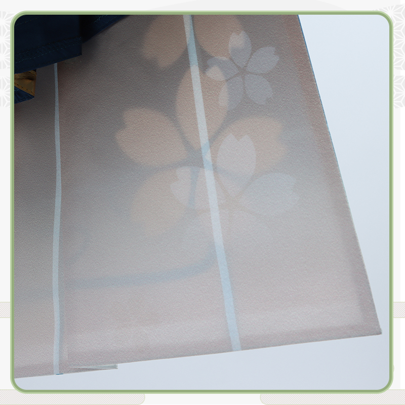 ジャガード生地と光沢布で製作しています。ブルーを基調として、胸先と裾に桜の絵柄がプリントされて綺麗に見えます。
