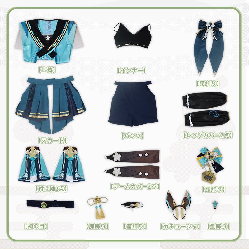 上着、インナー、スカート、パンツ、飾り物(カチューシャ、髪飾り、首飾り、房飾り、付け袖2点、アームカバー2点、腰飾り2点、神の目、レッグカバー2点)