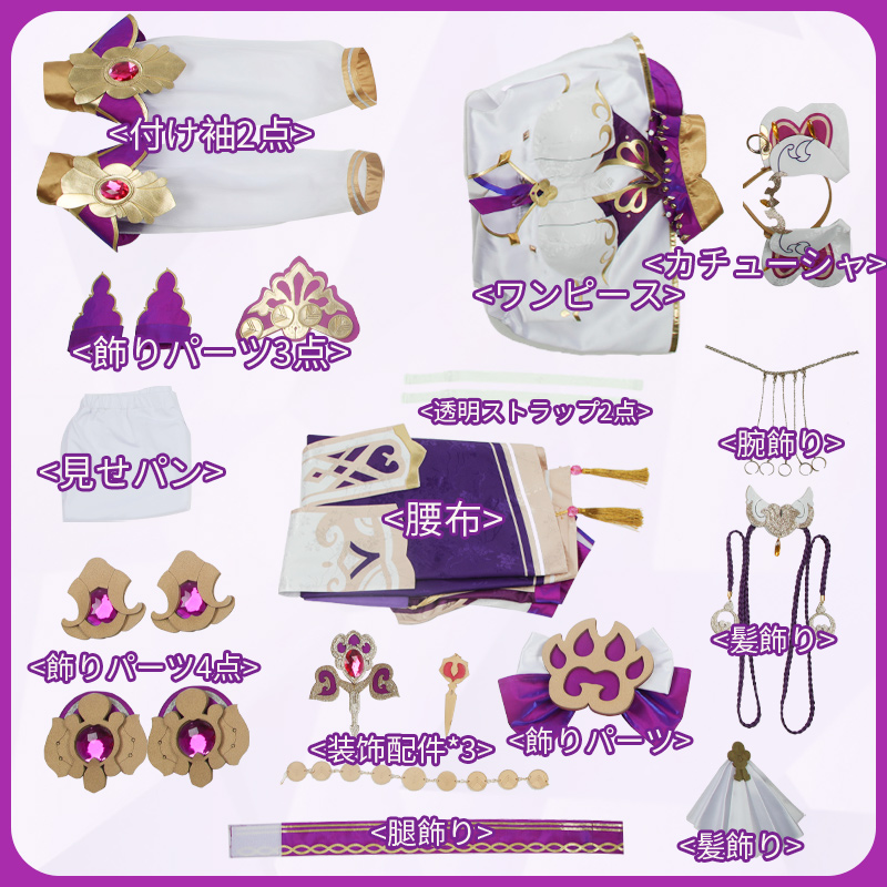 ワンピース、見せパン、飾り物(カチューシャ、髪飾り2点、透明ストラップ2点、付け袖2点、腕飾り、腰布、飾りパーツ11点、腿飾り)