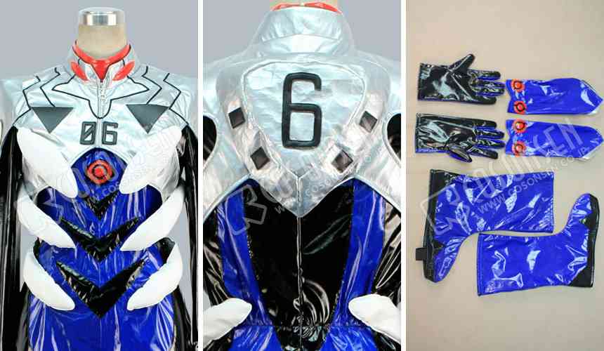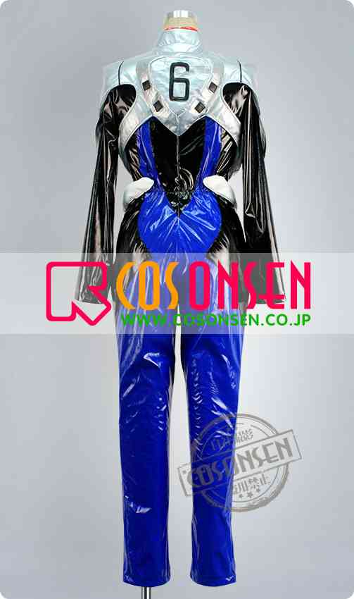 ブルーと黒を基調したエナメル生地で製作します。肩の周りは銀色を基調して、黒の線がプリントします。袖は合皮生地で製作します。胸の真ん中に番号06をプリントします。