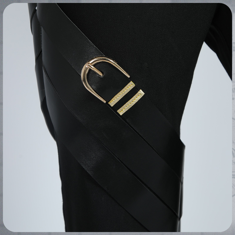 デニムで製作しています。黒を基調として、裾にスリットが入って、ユニークなデザインで印象的です。
