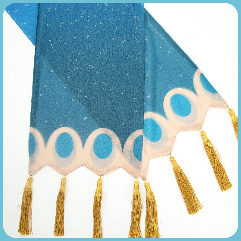 ポリエステルギャバで製作しています。黒を基調として、正面と後ろに孔雀羽の絵柄がプリントされて綺麗に見えます。