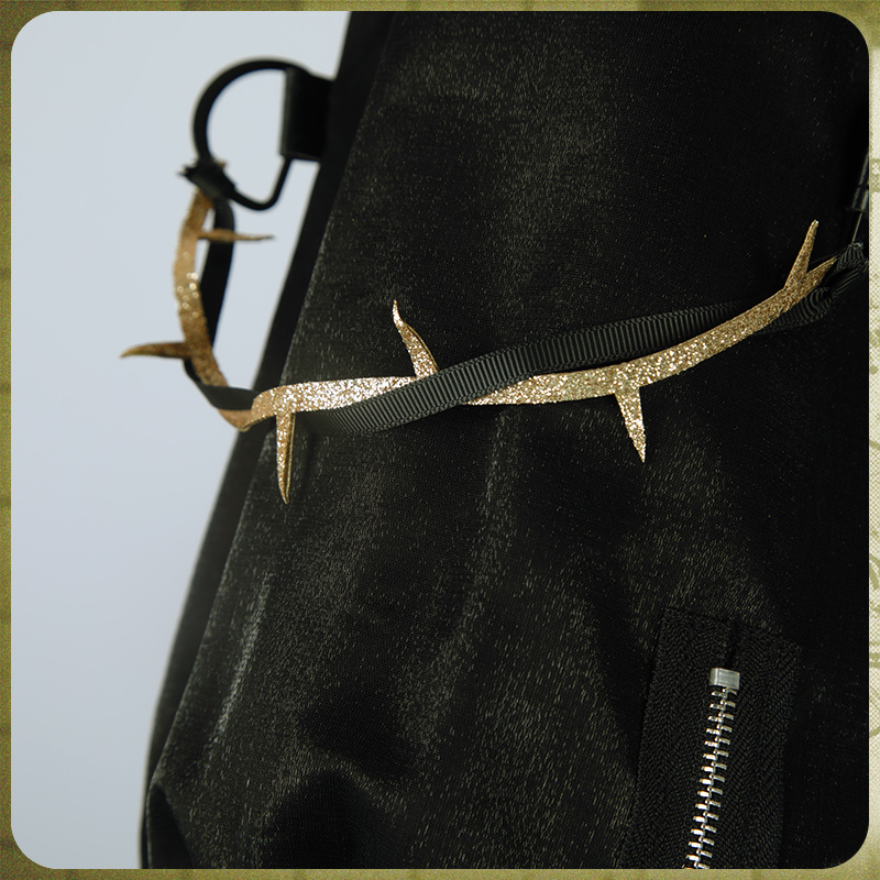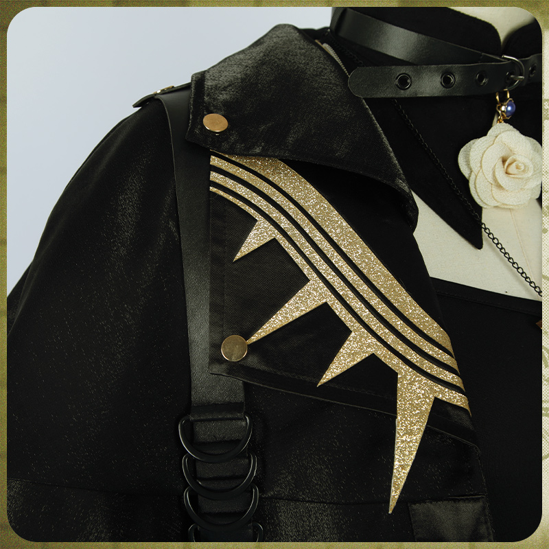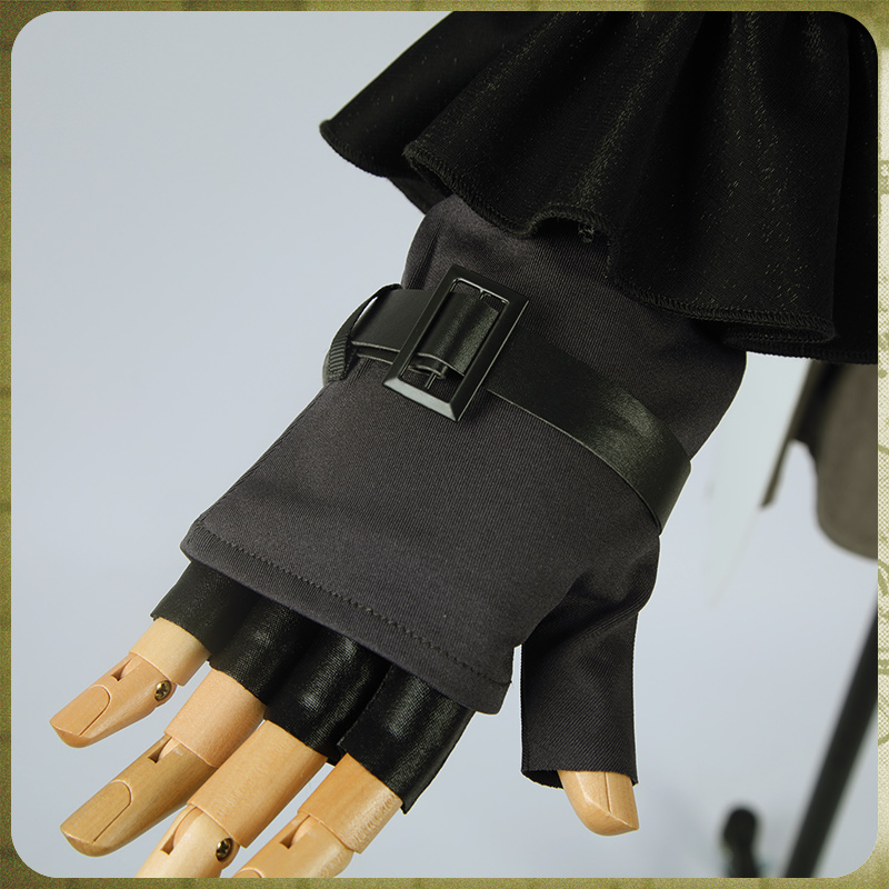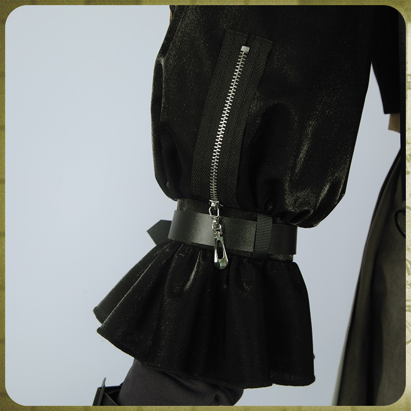 光沢布で製作しています。黒を基調として、裾部分は非対称のデザインで、両袖にチャックが飾ってあり、かっこいいです。