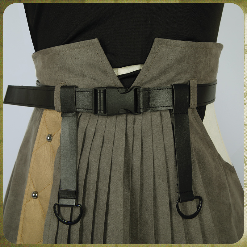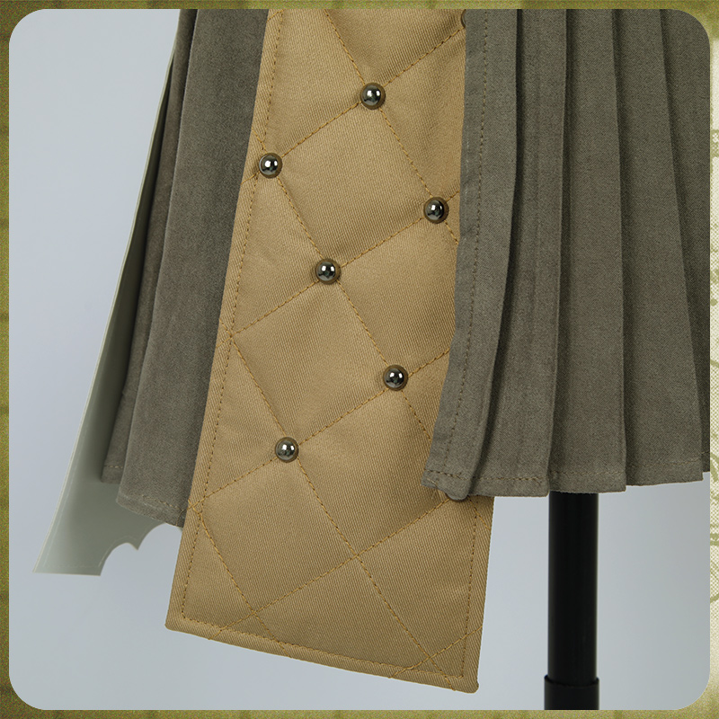 スエード生地で製作しています。無地のプリーツスカートで普段にも着られます。