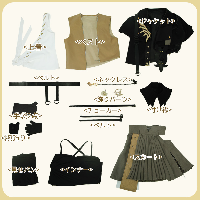 ジャケット、ベスト、上着、インナー、スカート、見せパン、飾り物(チョーカー、付け襟、ネックレス、飾りパーツ、腕飾り、手袋2点、ベルト3点)