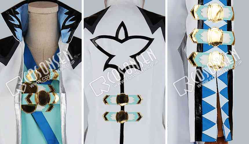 白い生地に銀色の柄模様で、裏地は水色となっています。両腕にある飾りと背中の絵柄が特徴です。