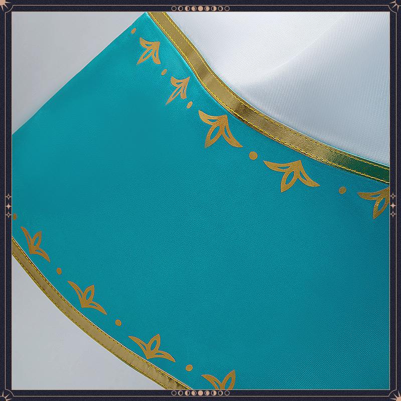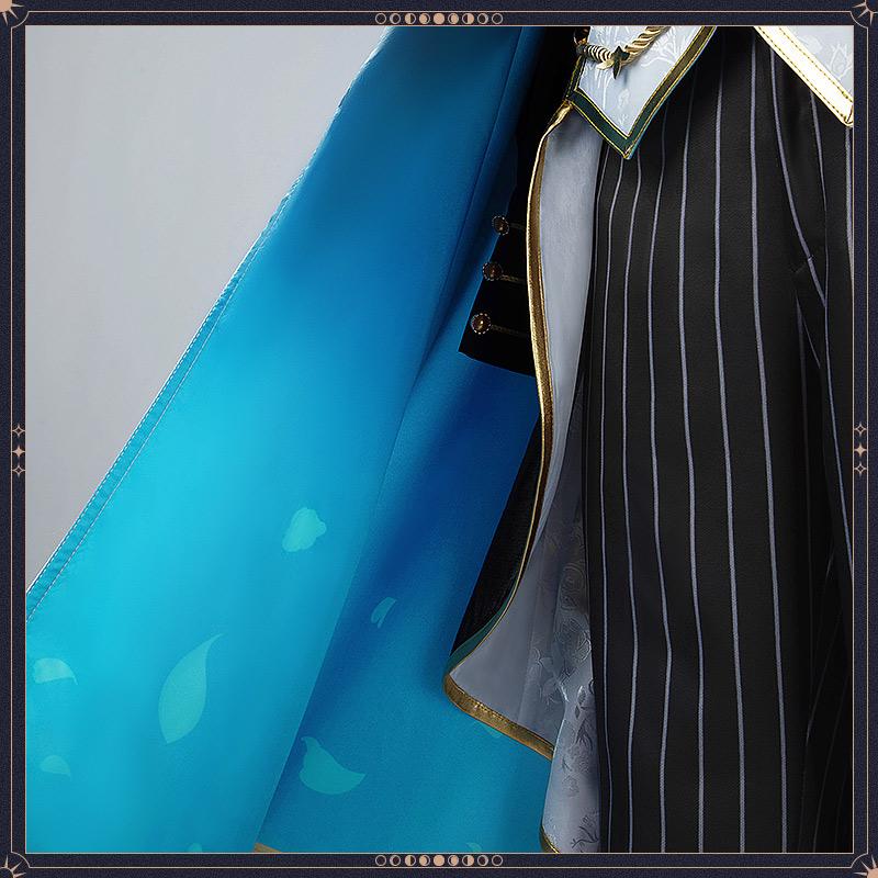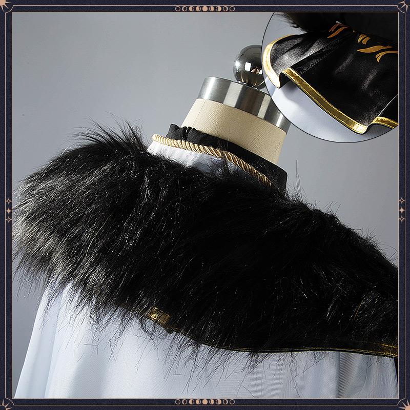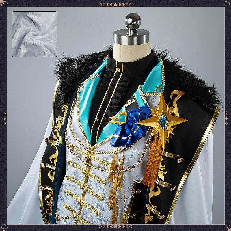 ポリエステルギャバと光沢布で製作しています。白と青を基調として、襟に黒いファーが施されてかっこいいです。