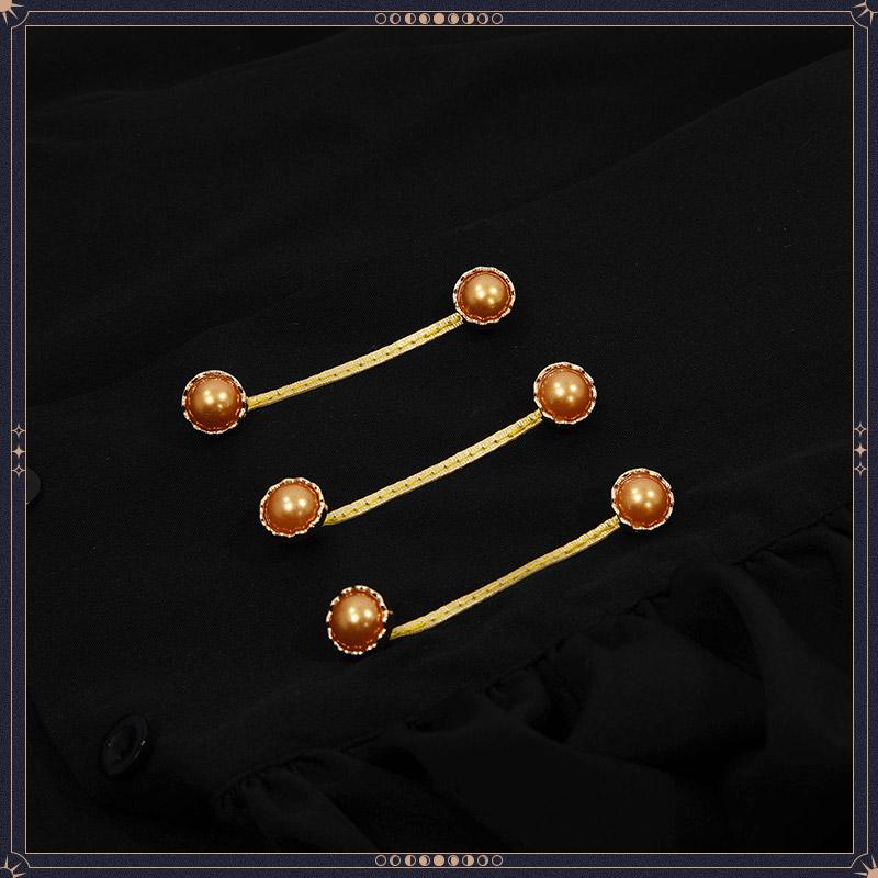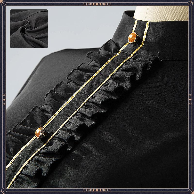 シャツ生地で製作しています。黒を基調として、襟と袖口に綺麗なボタンを縫い付けています。