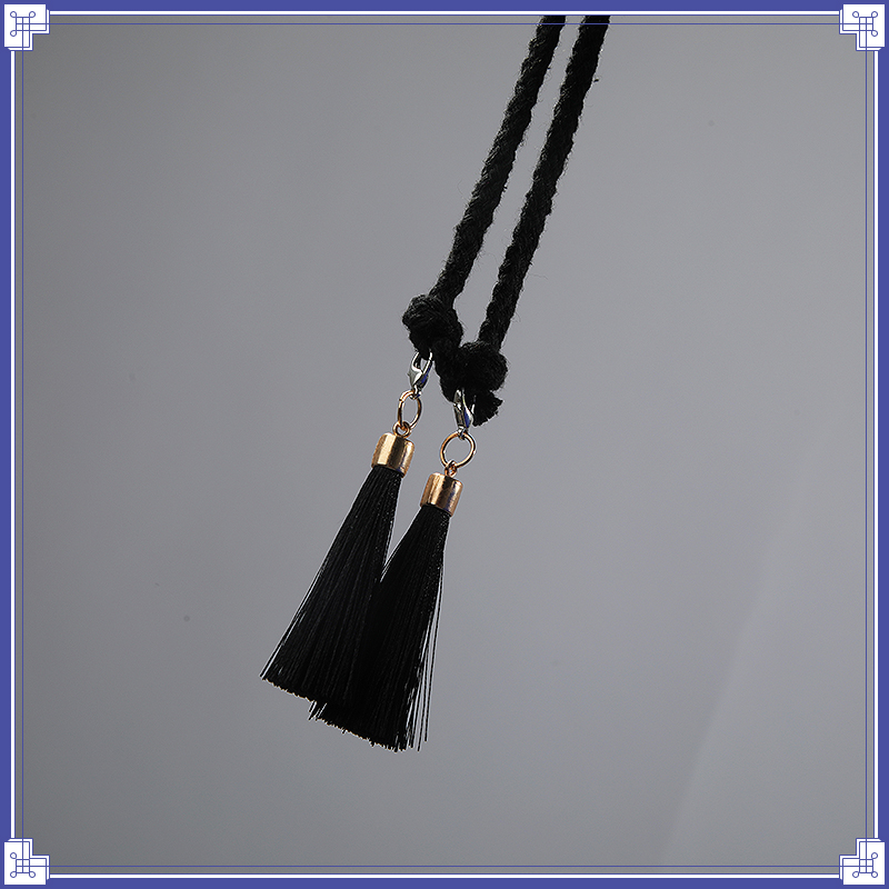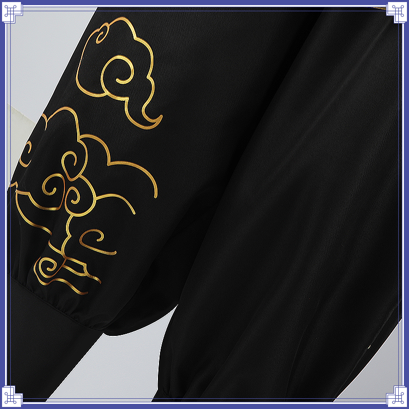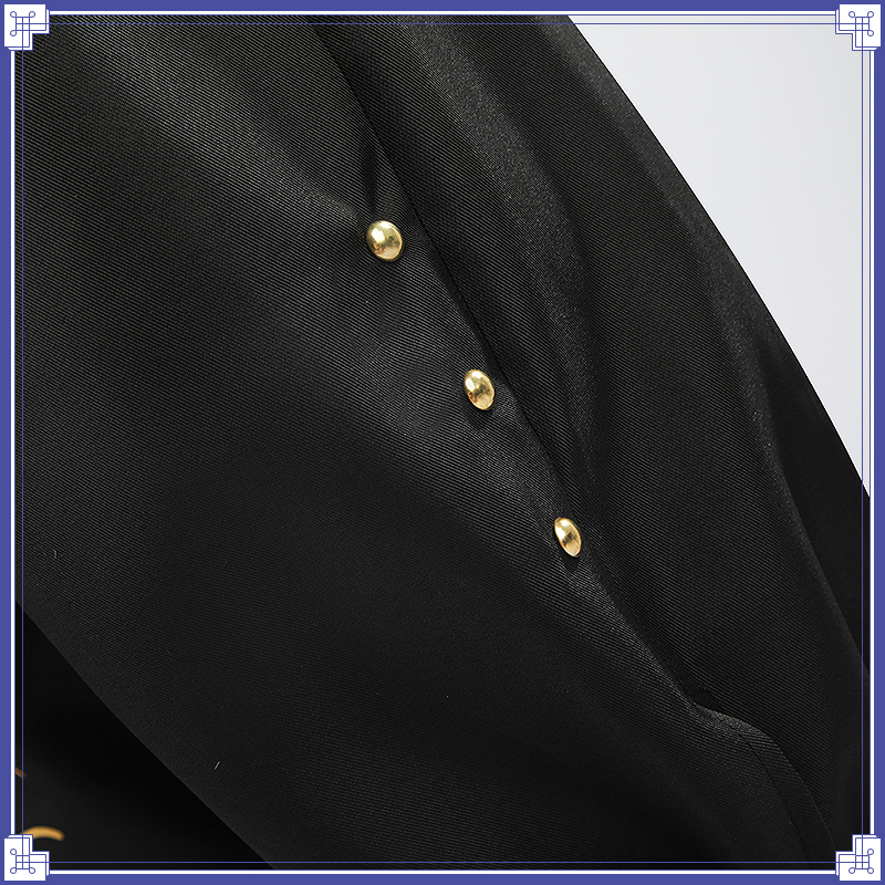 ポリエステルギャバで製作しています。黒を基調として、両サイドに本物のポケットが施されています。左側に金色の瑞雲柄が施されて綺麗に見えます。