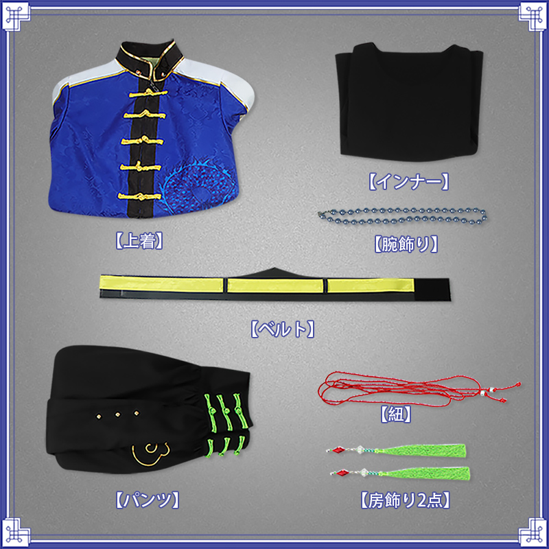 上着、インナー、パンツ、飾り物(房飾り2点、腕ベルト、腕飾り、ベルト、紐)