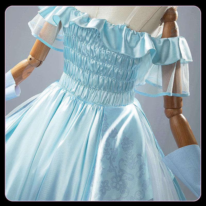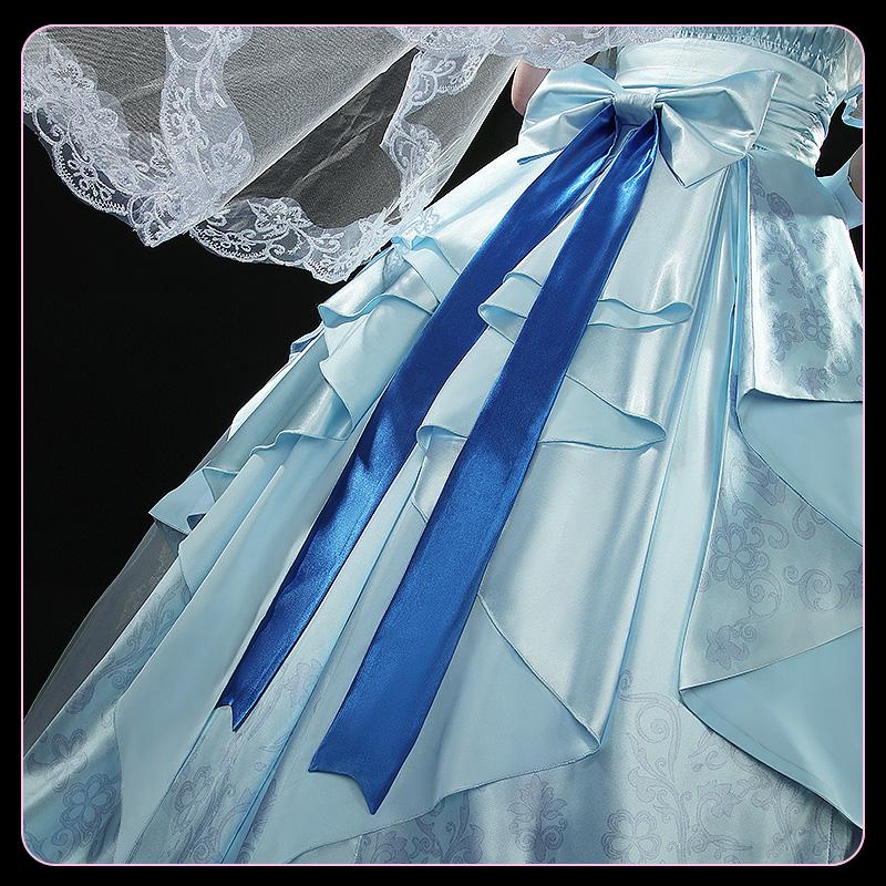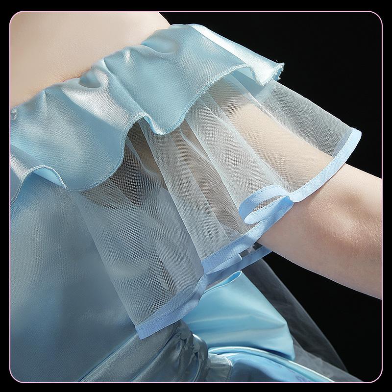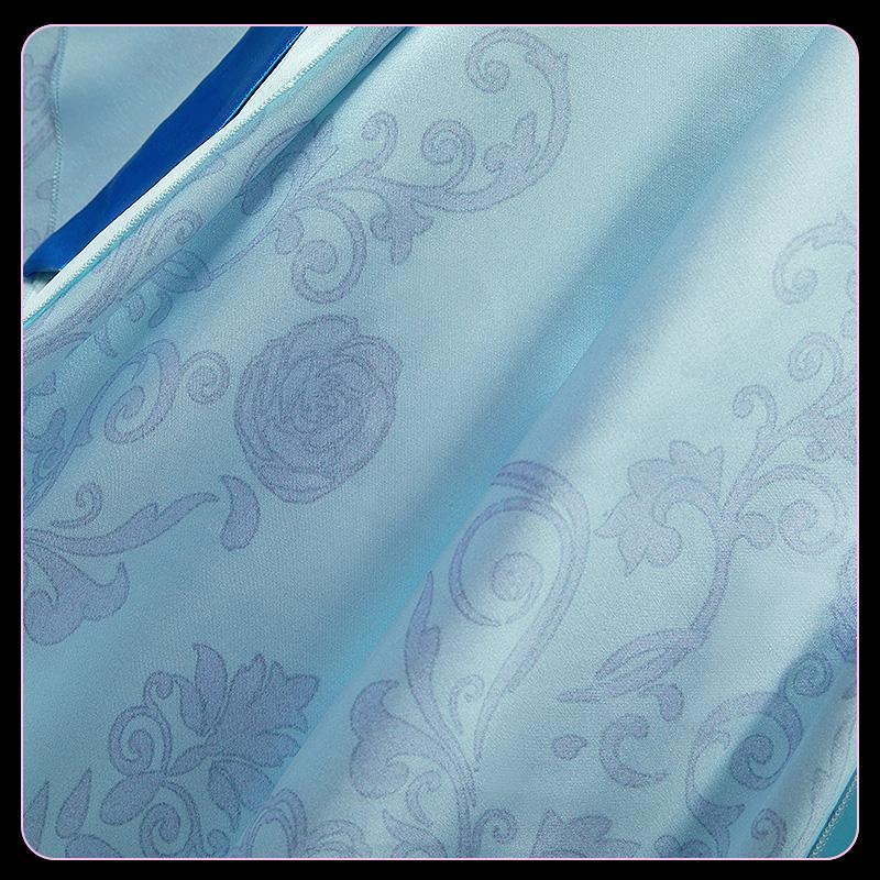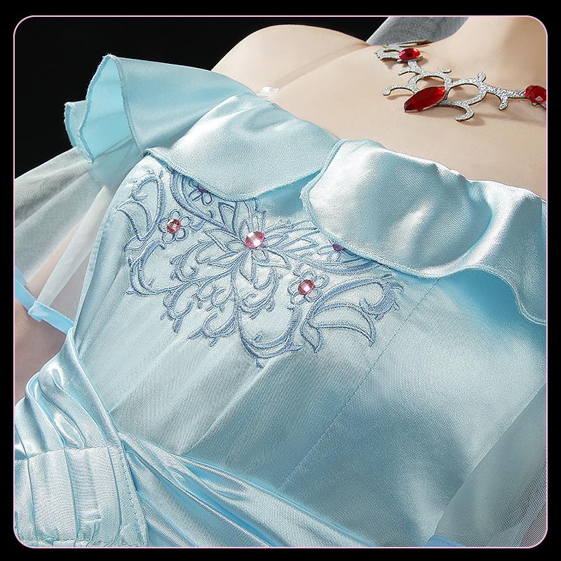 サテンで製作しています。ブルーを基調として、オフショルダーのワンピースで、胸先に刺繍が施されて上品な雰囲気に仕上がりました。生地にプリント模様がかすかに見えて再現度が高いです。