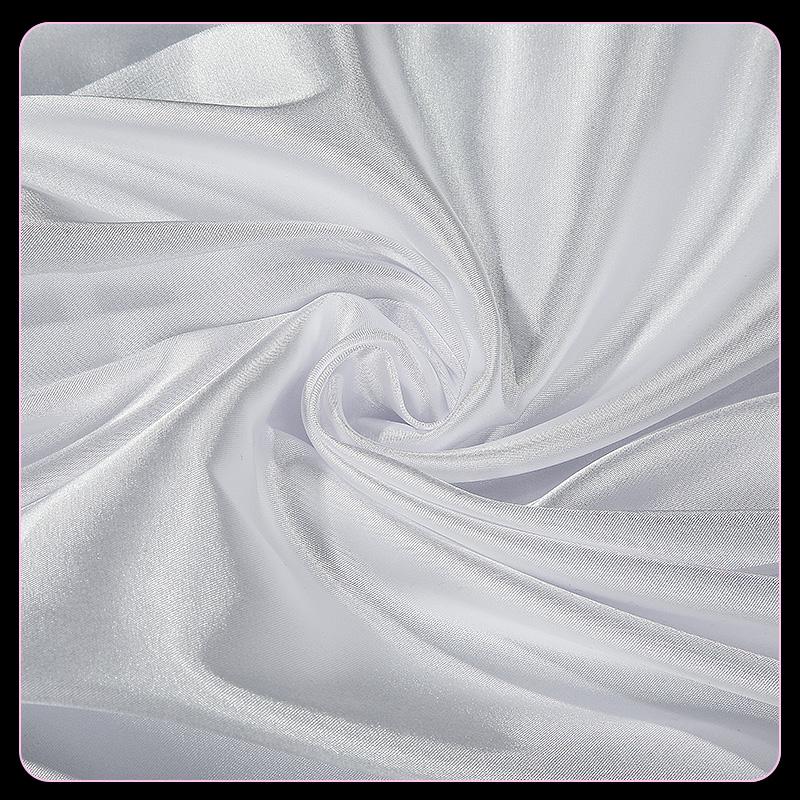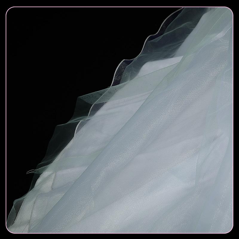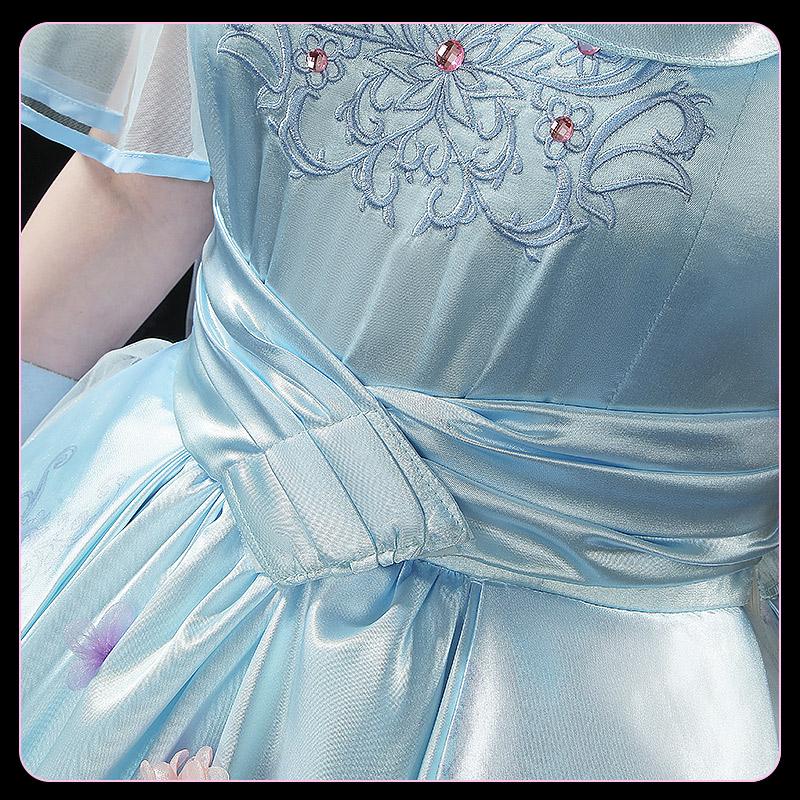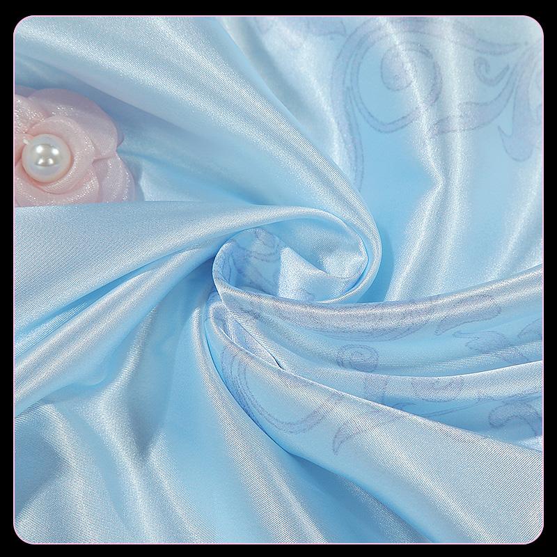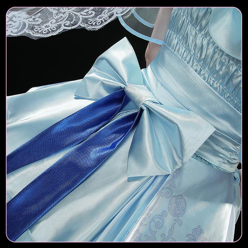 サテンで製作しています。ブルーを基調として、オフショルダーのワンピースで、胸先に刺繍が施されて上品な雰囲気に仕上がりました。生地にプリント模様がかすかに見えて再現度が高いです。