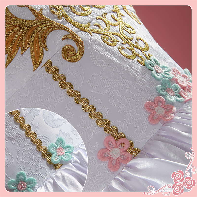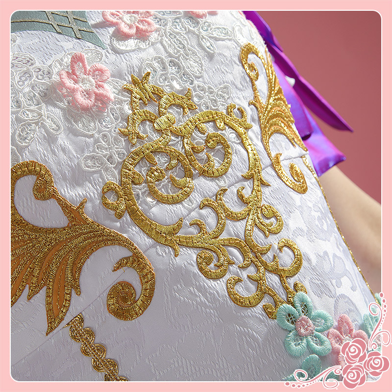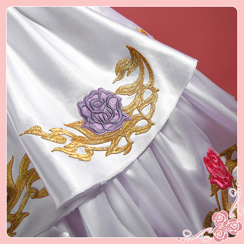 主にサテンで製作しています。ベアトップのデザインで、白地にいろいろな花の刺繡が施されて華やかなワンピースです。