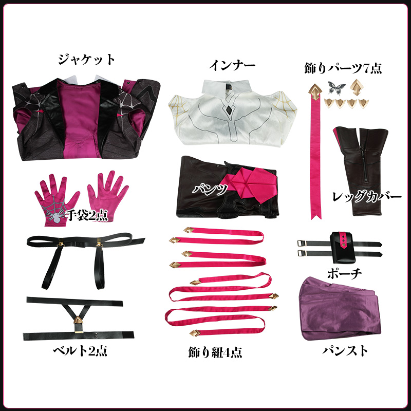 ジャケット、インナー、パンツ、飾り物(飾りパーツ6点、飾り紐5点、手袋2点、ポーチ、ベルト2点、レッグカバー、パンスト)