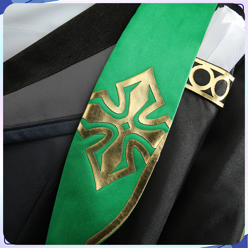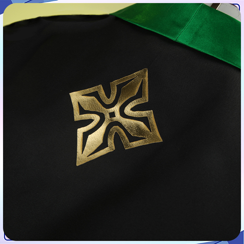 ポリエステルギャバとサテンで製作しています。黒と緑を基調として、襟と袖口に綺麗な飾りパーツが飾ってあり、とても華やかです。