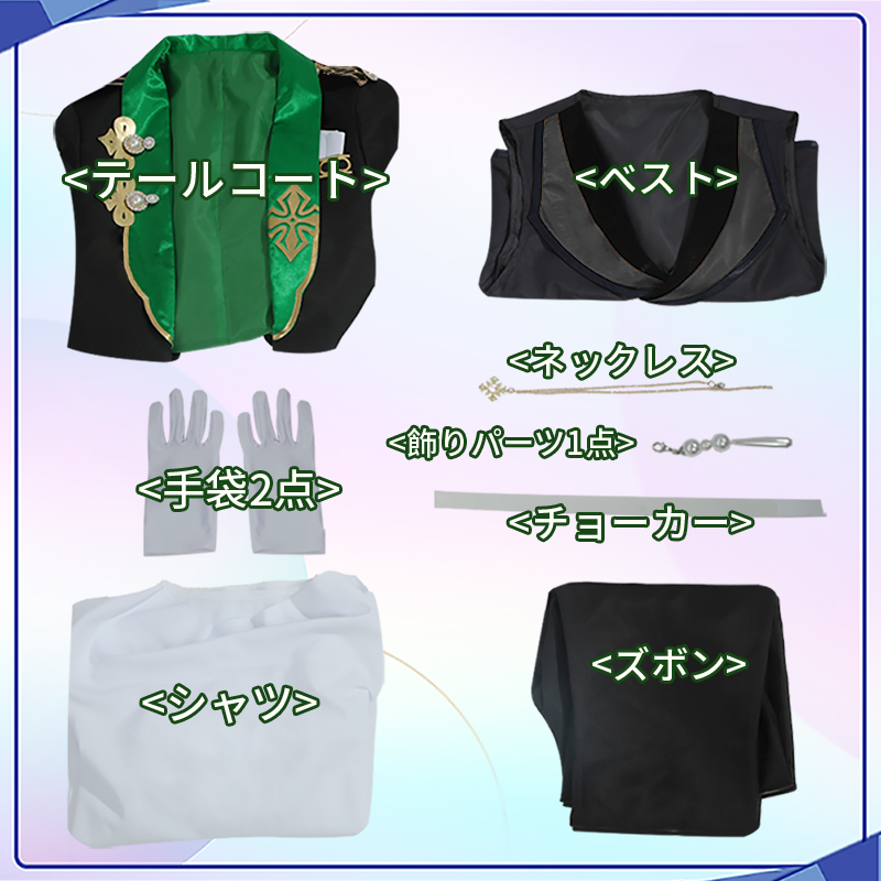 テールコート、ベスト、シャツ、ズボン、飾り物(チョーカー、ネックレス、飾りパーツ1点、手袋2点)
