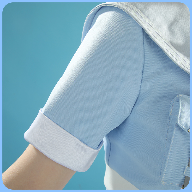 ポリエステルギャバで製作しています。セーラー風の上着で、襟にネコの柄がプリントされて超可愛いです。