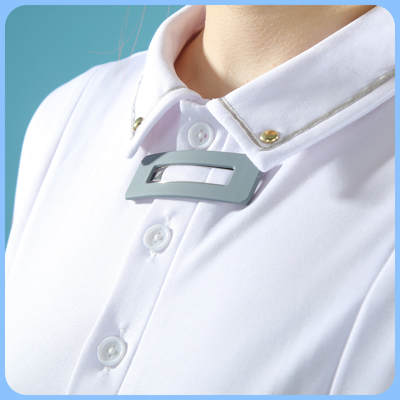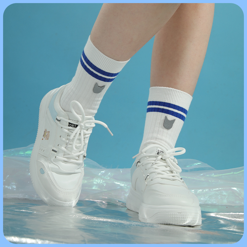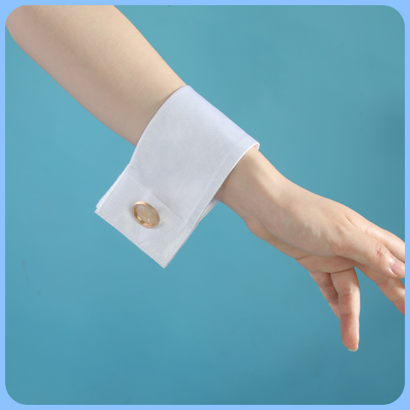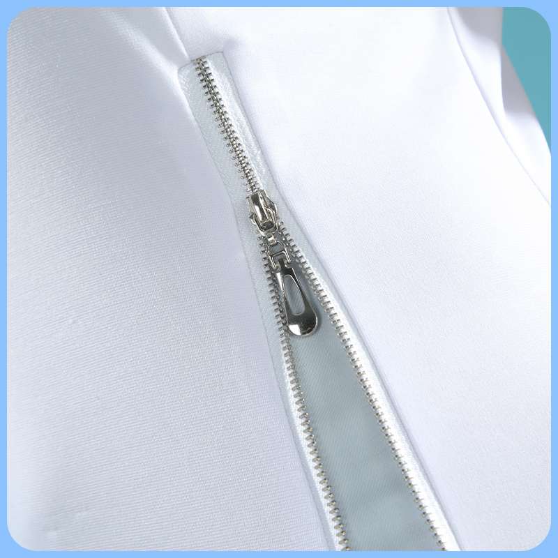 ニット生地で製作しています。白を基調として、両サイドに可愛いポケットが施されてユニークなデザインで印象的です。