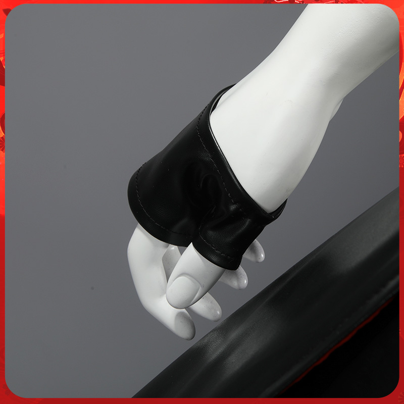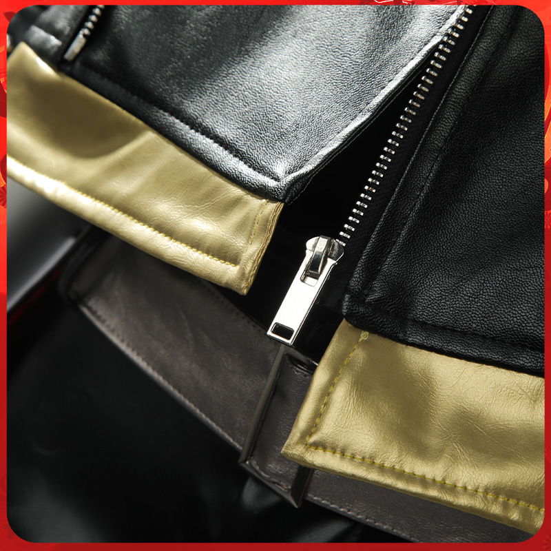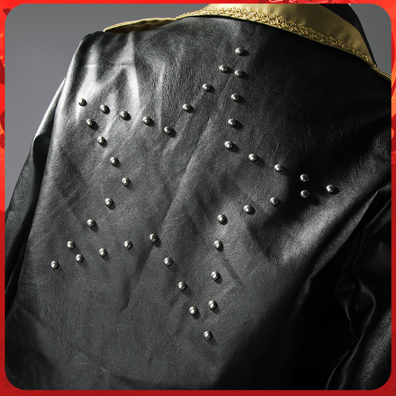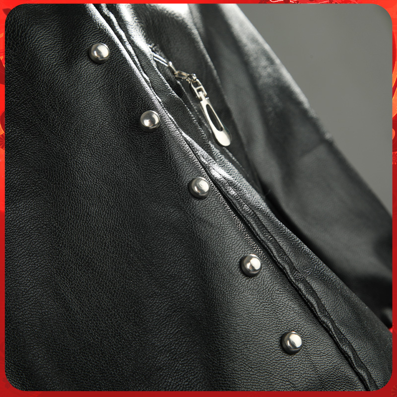 合皮で製作しています。黒を基調として、袖口と後ろにリベットが飾ってあり、かっこいいです。