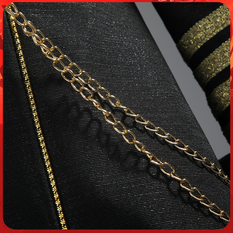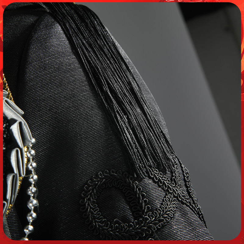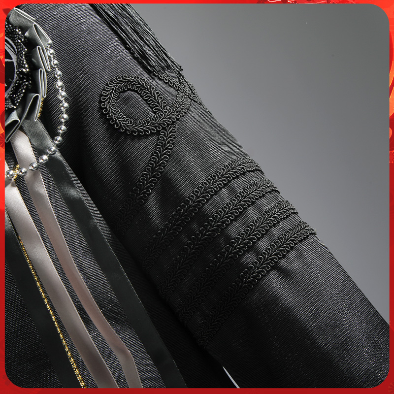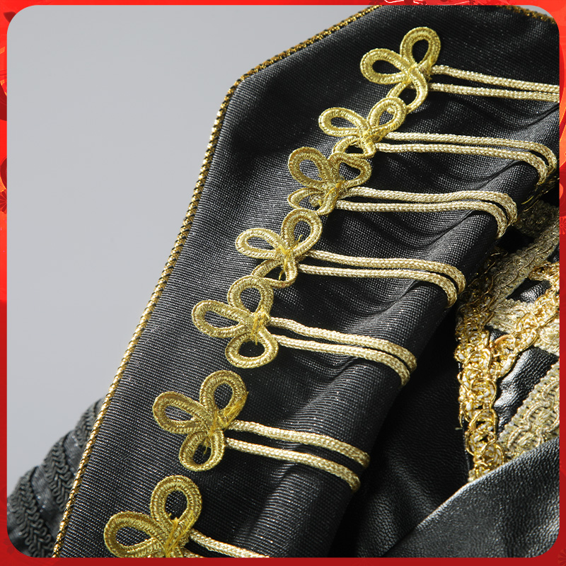 複合織物で製作しています。黒いコートで、襟に金色の紐を縫い付けて、袖口と裾に黒いファーが施されて華やかです。