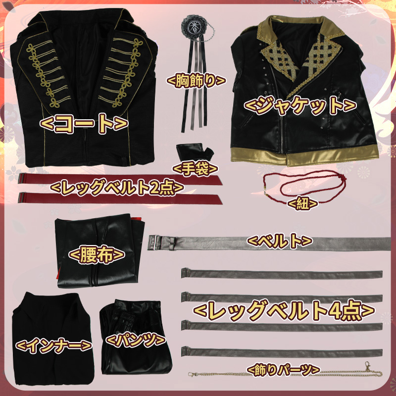 コート、ジャケット、インナー、パンツ、飾り物(胸飾り、飾りパーツ、紐、腰布、ベルト、レッグベルト6点)