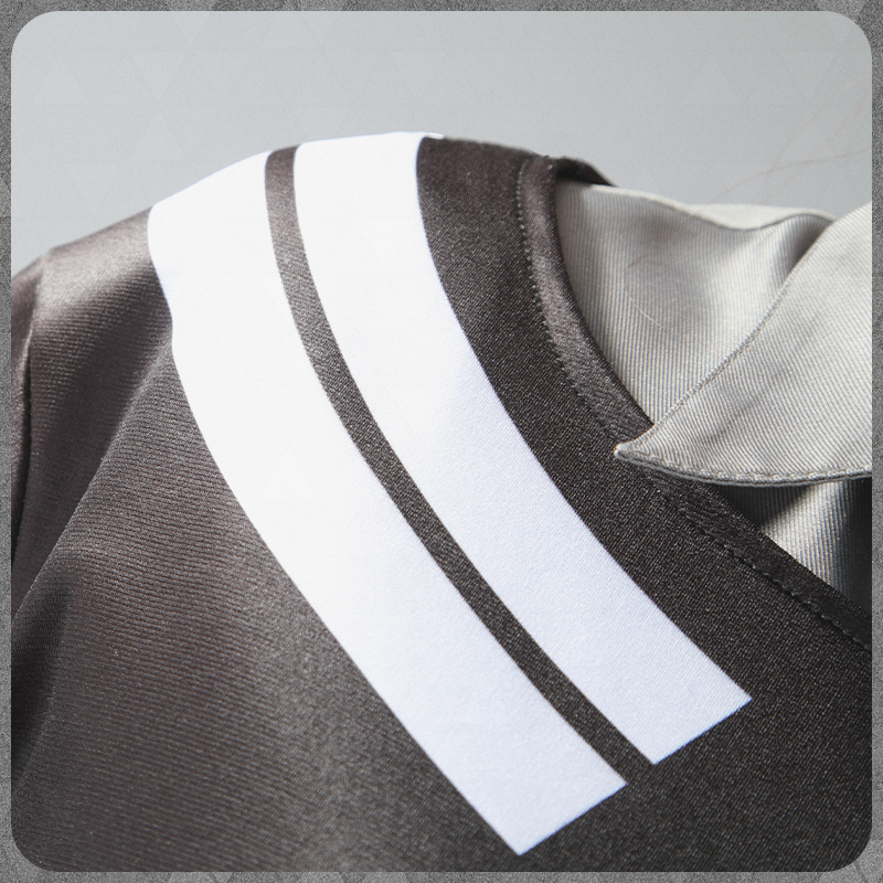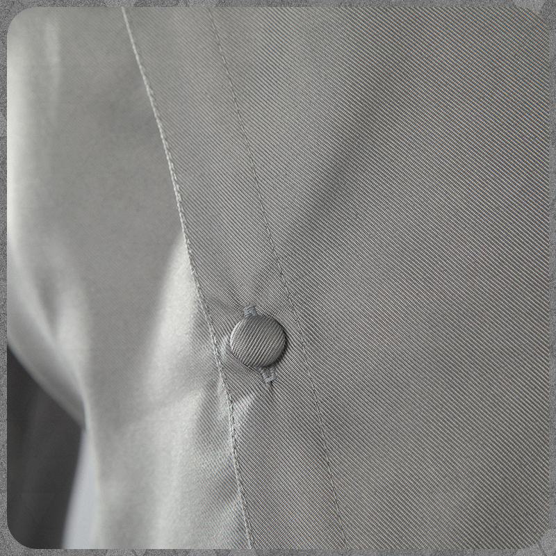 ポリエステルギャバで製作しています。灰色のシンプルなデザイン、いい素材を使ったので、着心地が良いです。