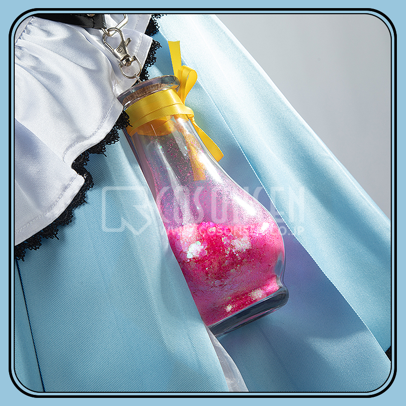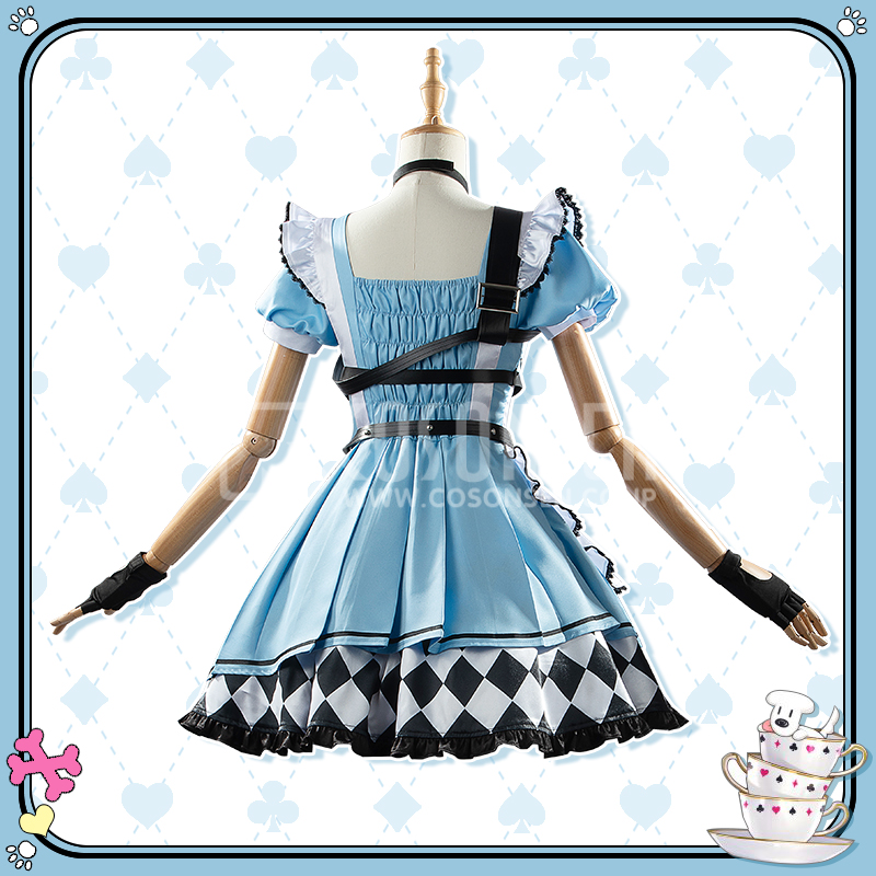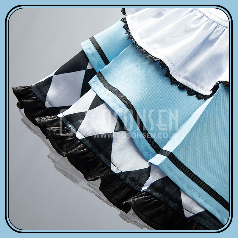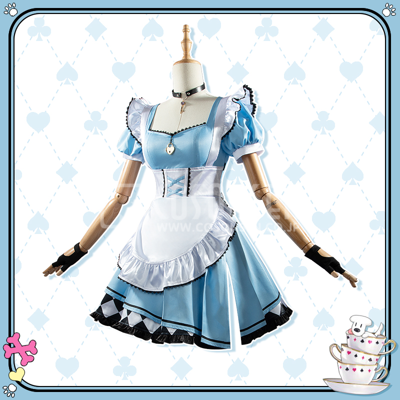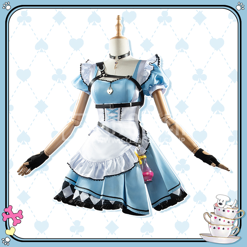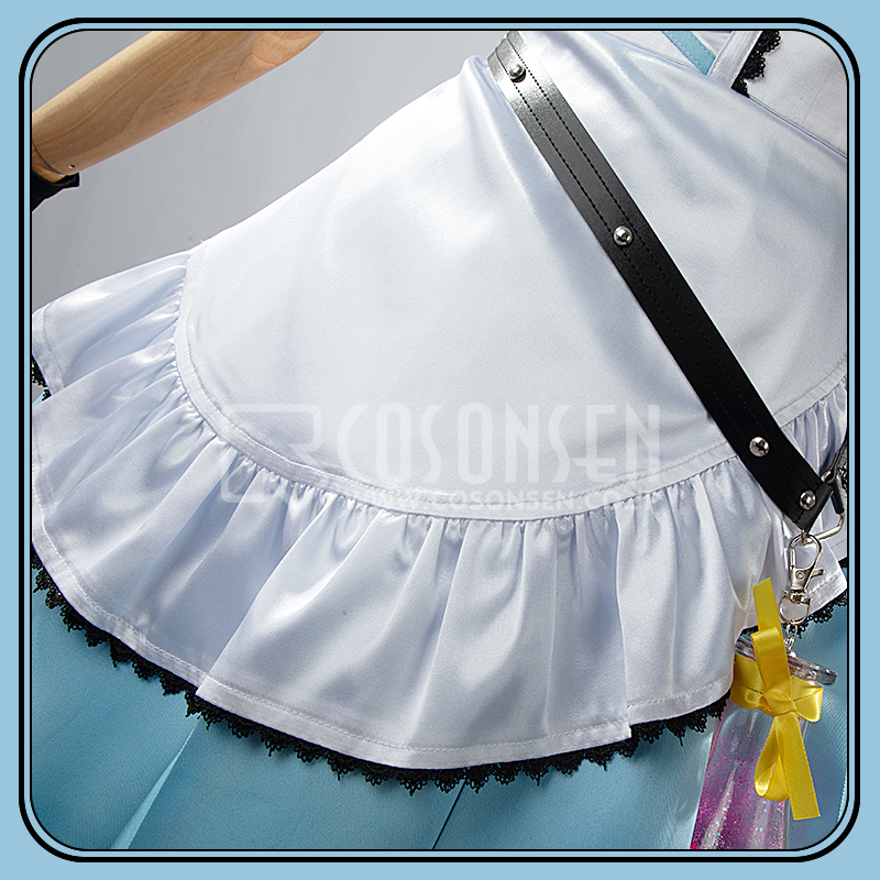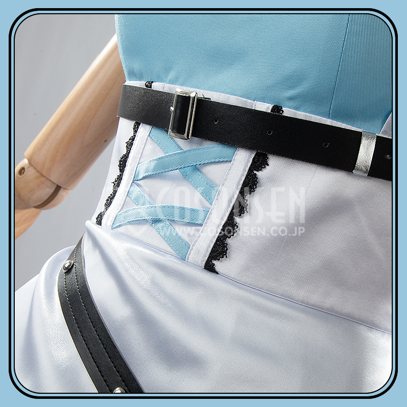 ポリエステルギャバとサテンで製作しています。青を基調としたメイド服で、襟元にハート型のロックが飾られて、超可愛いです。