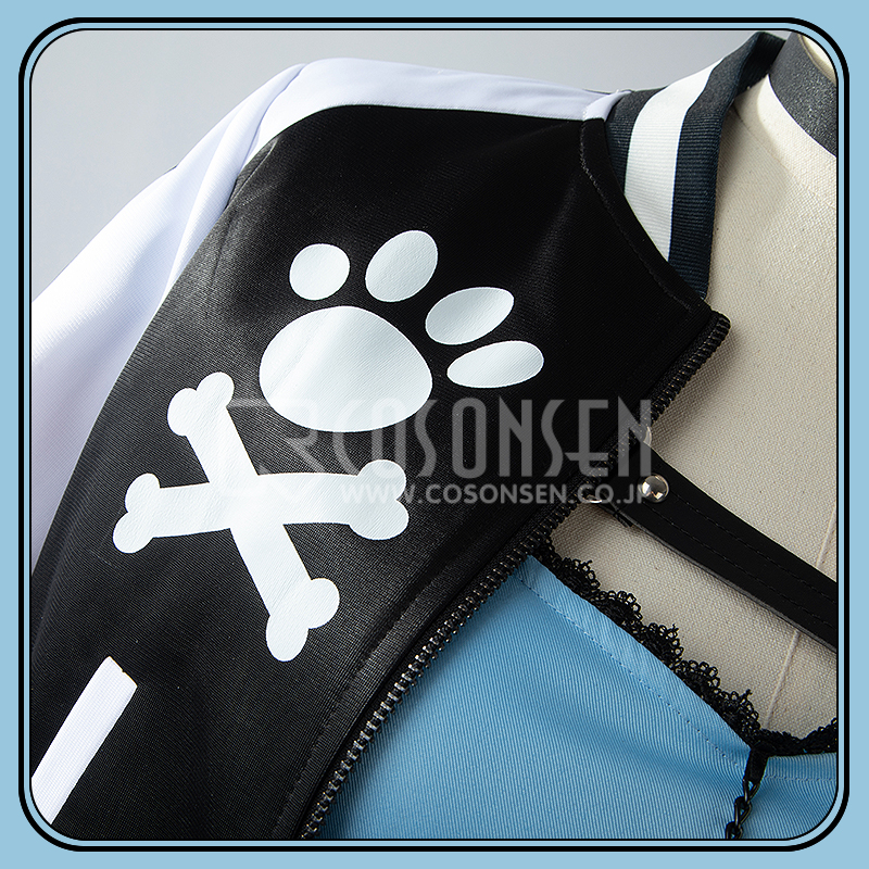 ジャージ生地で製作しています。黒と白を組み合わせたジャケットで、フロントに犬の肉球と骨の絵柄がプリントされて再現度が高いです。