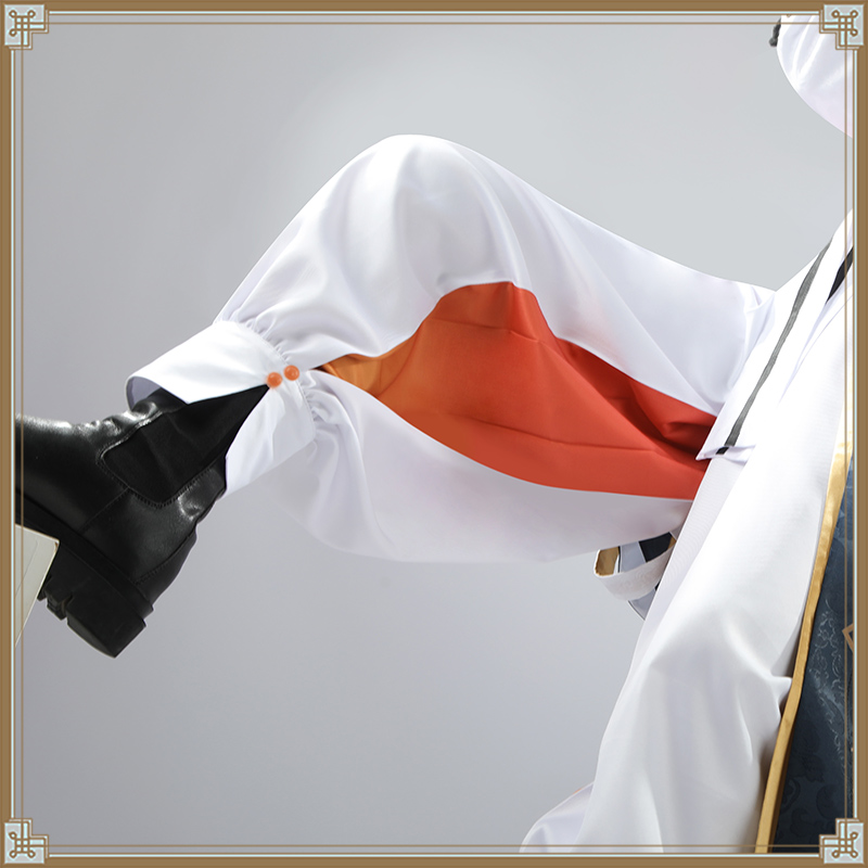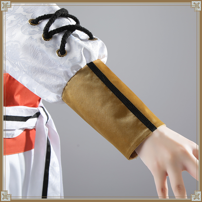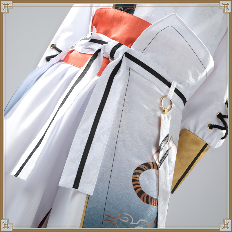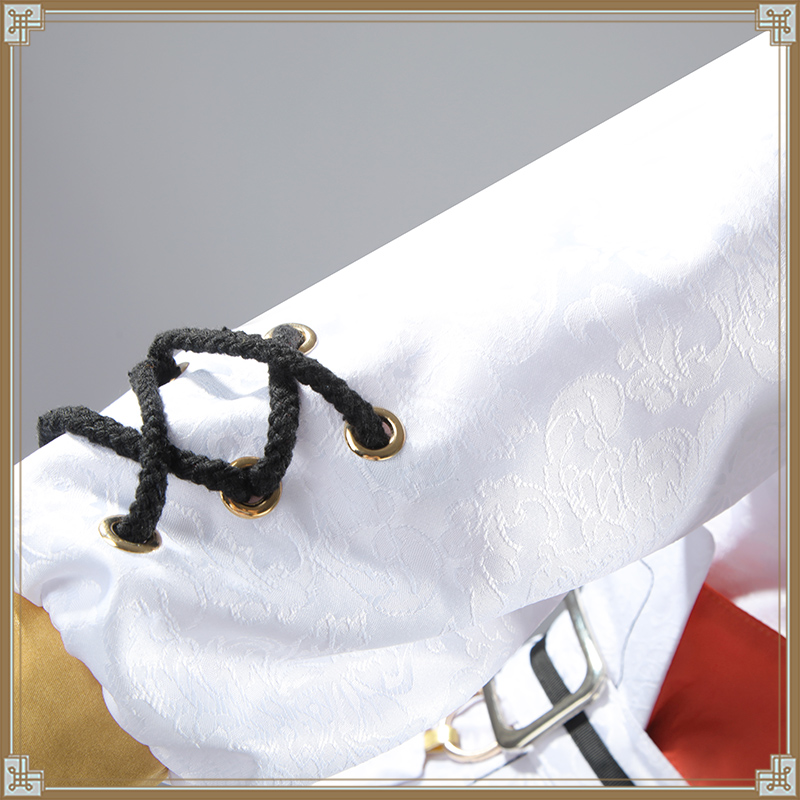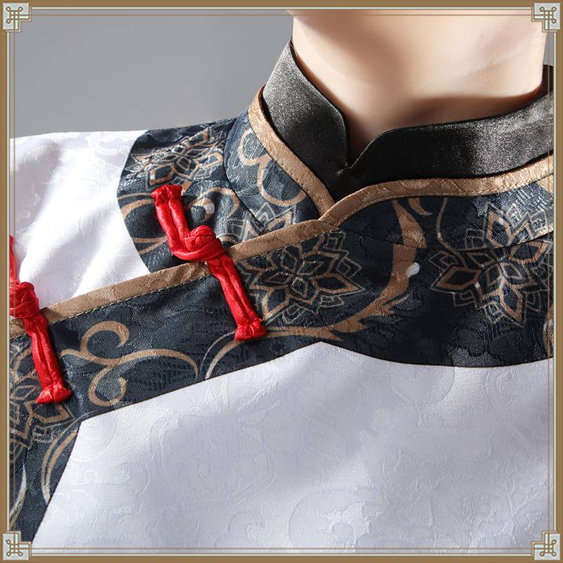 ジャガード生地で製作しています。白を基調として、襟に中華風の絵柄がプリントされて再現度が高いです。