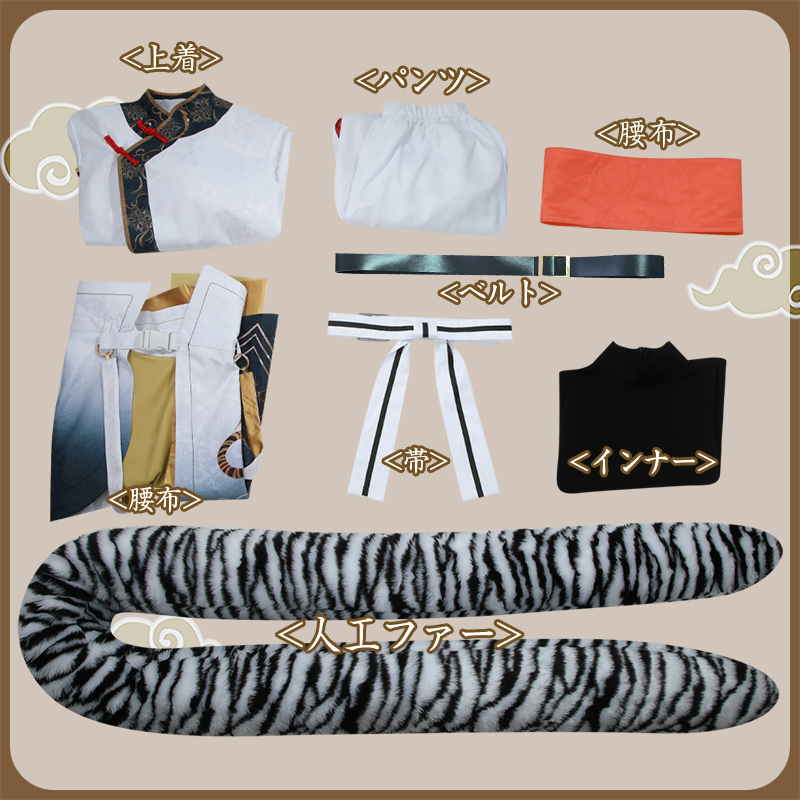 上着、インナー、パンツ、飾り物(ベルト、腰布2点、帯、人工ファー)