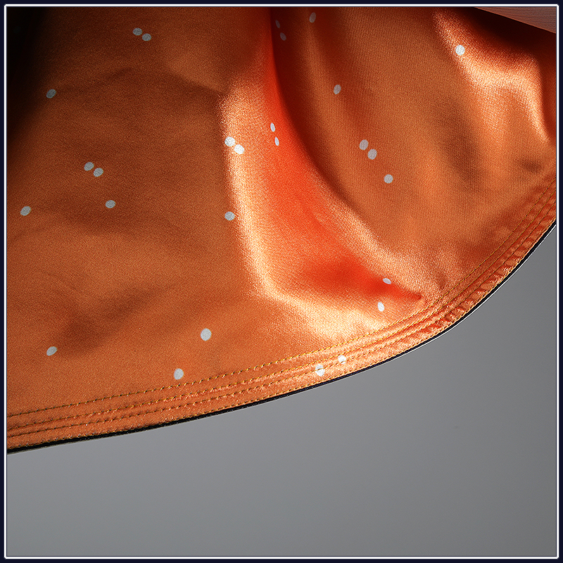 光沢布で製作しています。光沢感のある素材を使って綺麗に見えます。右側にチャックが付いて脱着が便利です。