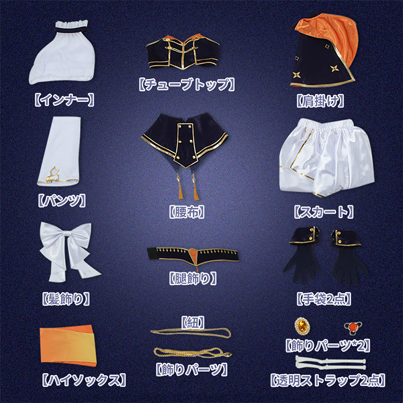 チューブトップ、インナー、スカート、パンツ、飾り物(髪飾り、肩掛け、透明ストラップ2点、飾りパーツ3点、紐、手袋2点、腰布、腿飾り、ハイソックス)