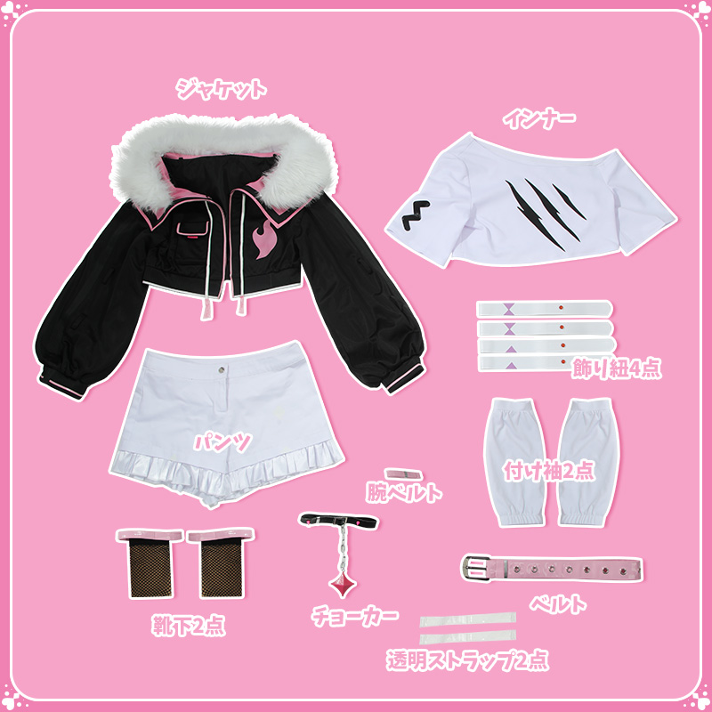 ジャケット、インナー、パンツ、飾り物(チョーカー、透明ストラップ2点、付け袖2点、腕ベルト、飾り紐4点、ベルト、靴下2点)