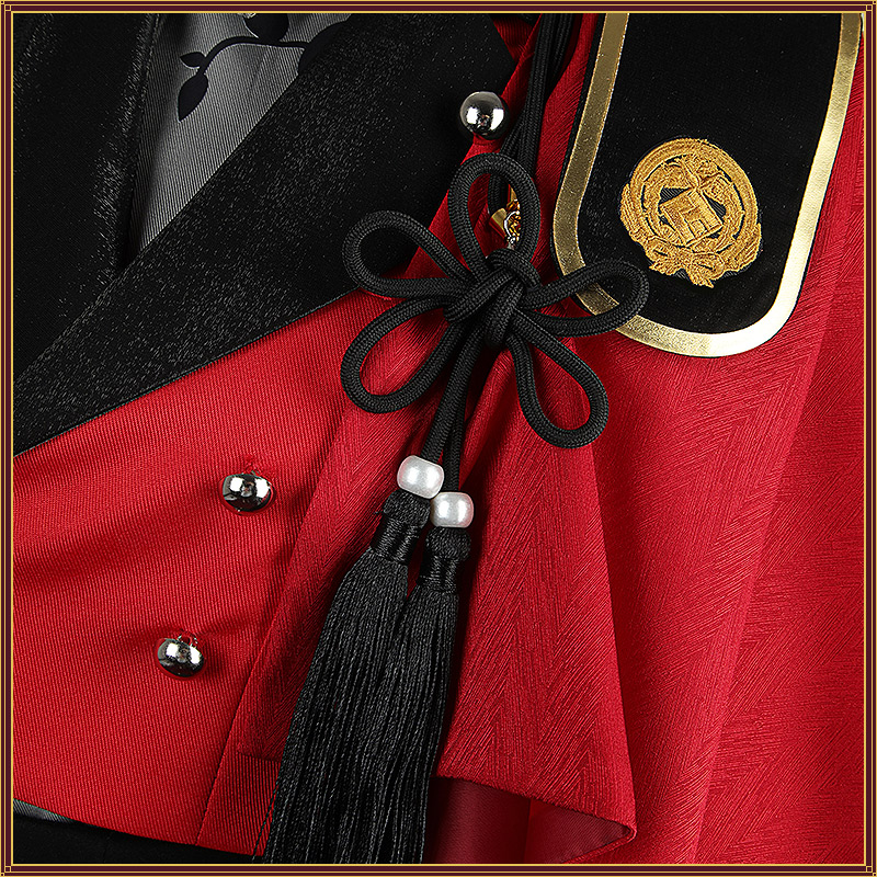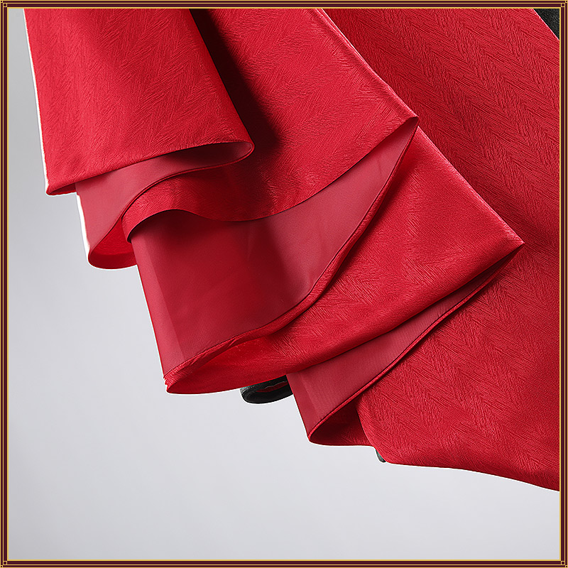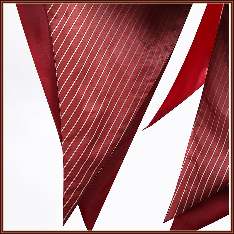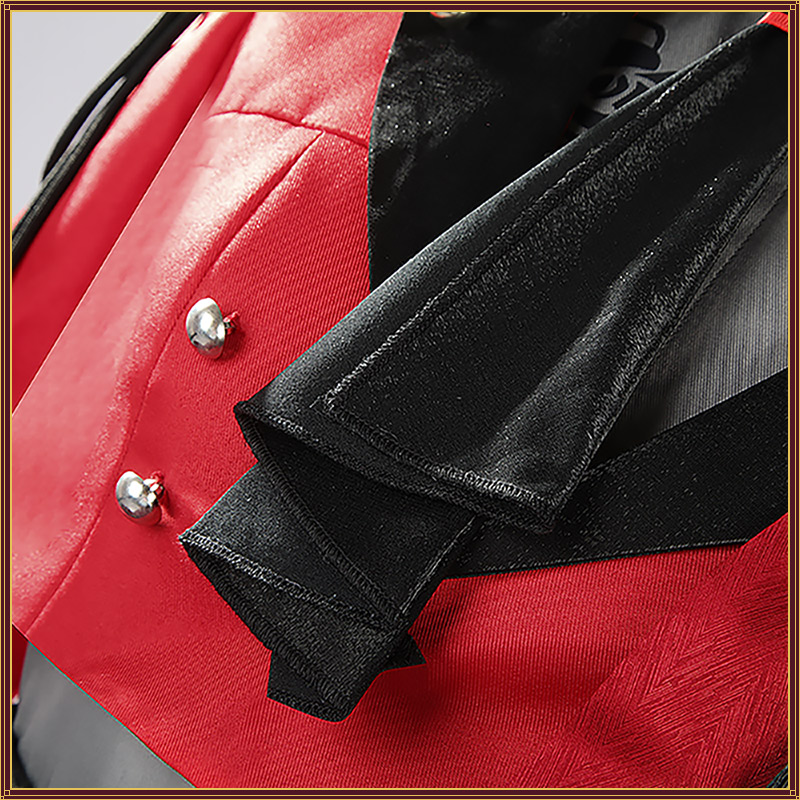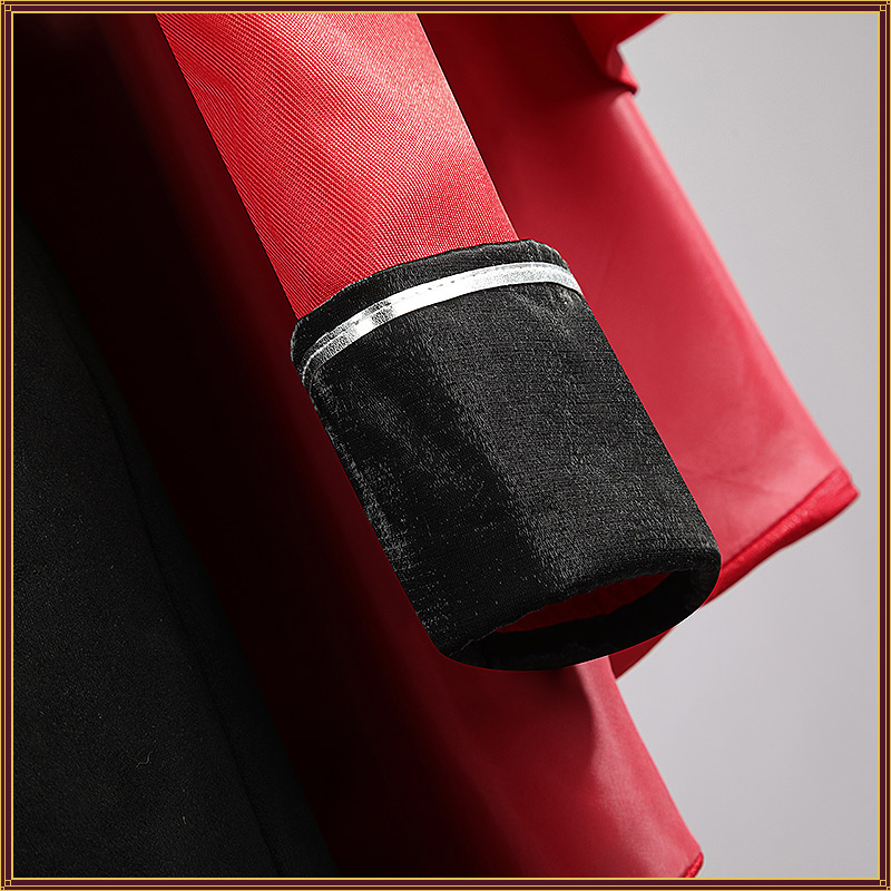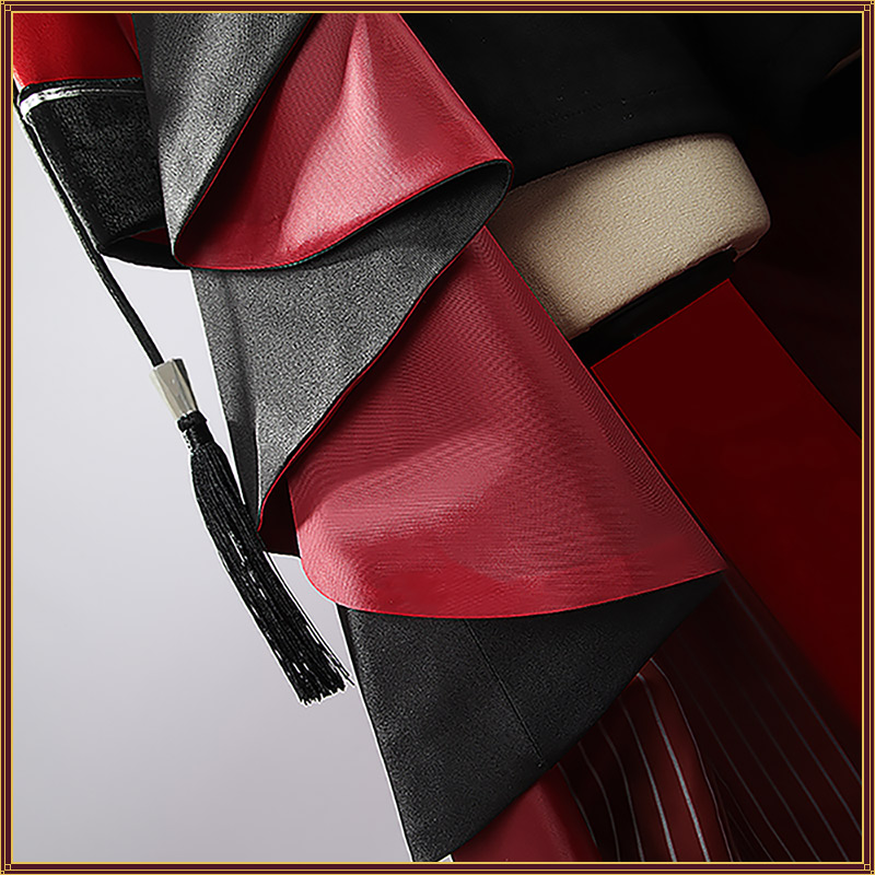 ポリエステルギャバと光沢布で製作しています。赤と黒を基調として、左肩に綺麗な刺繡片が施されて再現度が高いです。