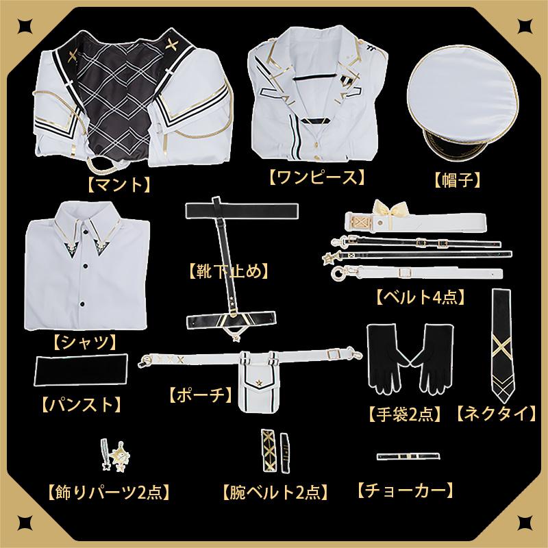 マント、ワンピース、シャツ、飾り物(帽子、チョーカー、ネクタイ、腕ベルト2点、手袋2点、飾りパーツ2点、ベルト4点、ポーチ、靴下止め、パンスト)