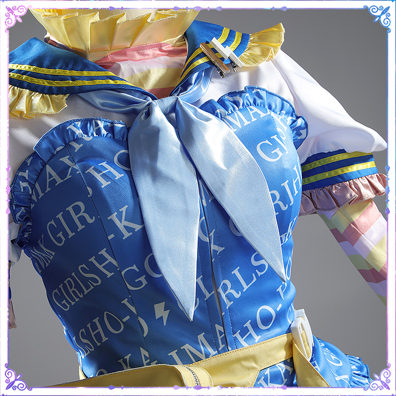 ポリエステルギャバで製作しています。セーラー風の半袖で、襟と袖口に可愛いフリルが施されて再現度が高いです。