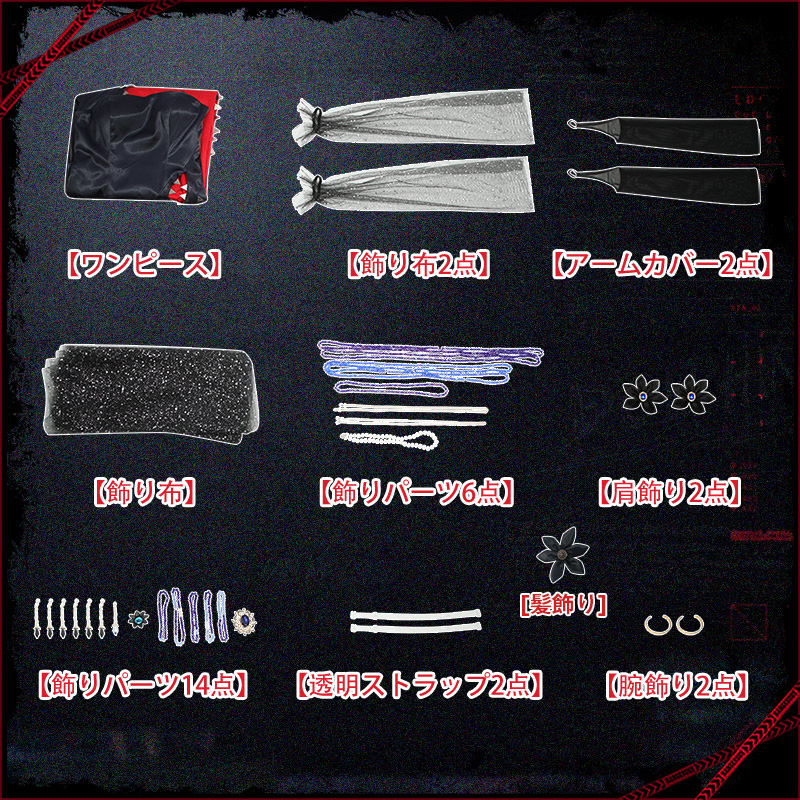 ワンピース、飾り物(飾り布2点、アームカバー2点、飾り布、飾りパーツ6点、肩飾り2点、飾りパーツ14点、透明ストラップ2点、髪飾り、腕飾り2点)